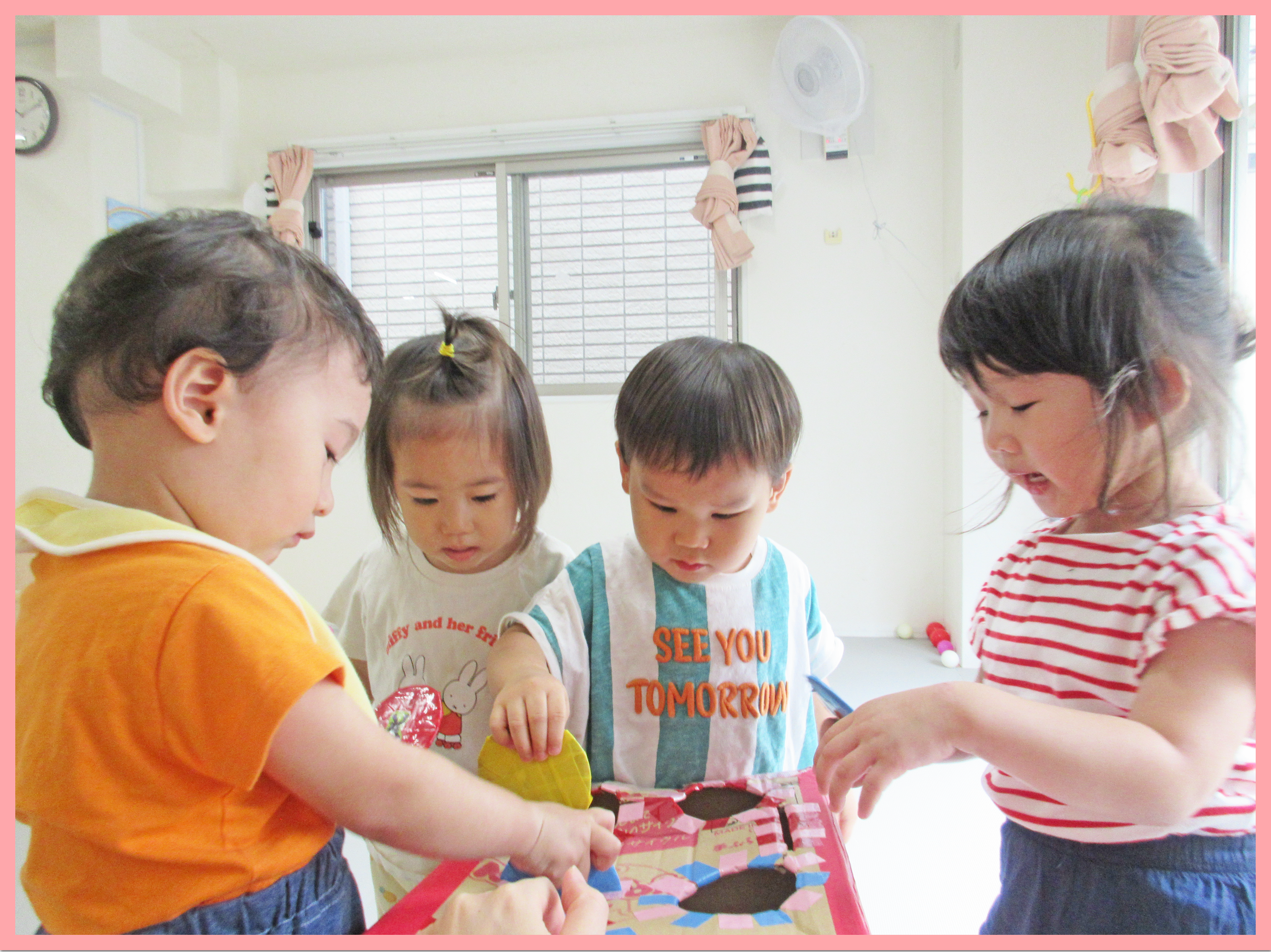 お店屋さん役の保育者に、「ください」と言った後、「ペッタンシールください」と言っていて微笑ましかったです。