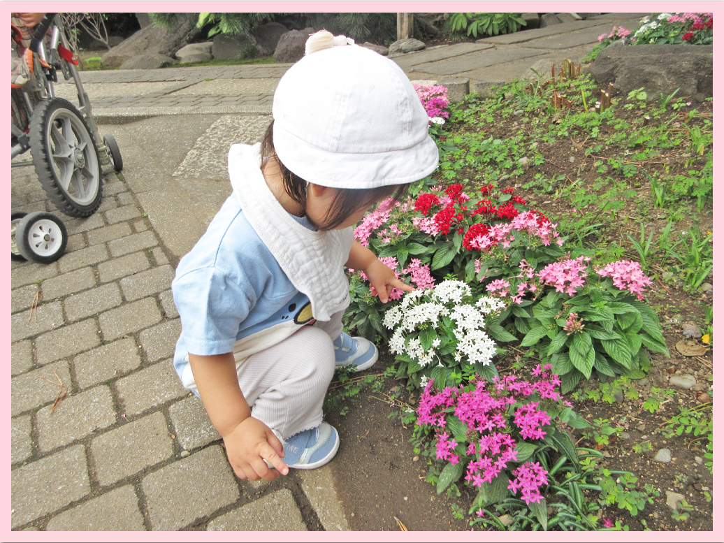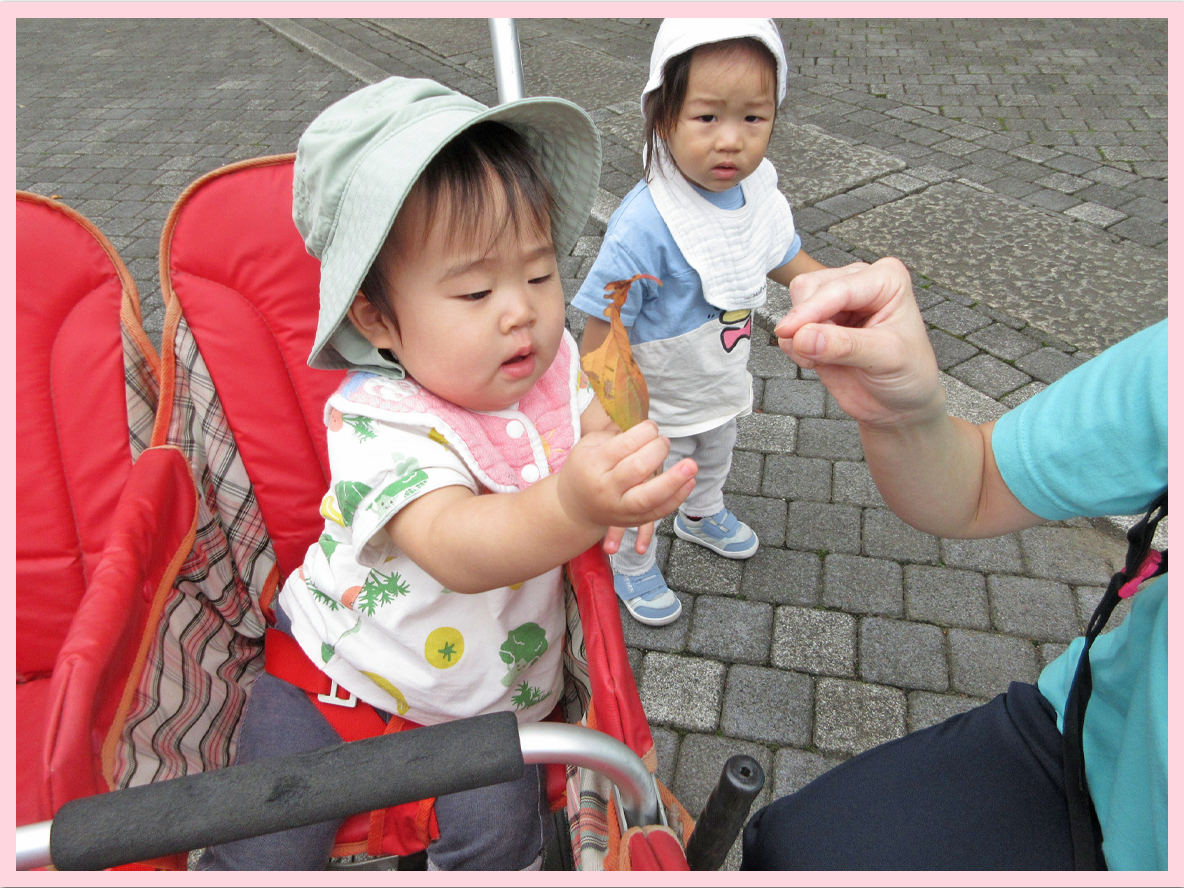 常行寺までお散歩に行きました。バギーから降りて歩きながら探索を楽しみました。落ち葉を拾ったり、アリを見つけて観察をしたり自然を感じることができました。近隣から音楽が聞こえてくると手をぱちぱちと鳴らしてリズムに乗りながらご機嫌に戸外活動を楽しみました。
