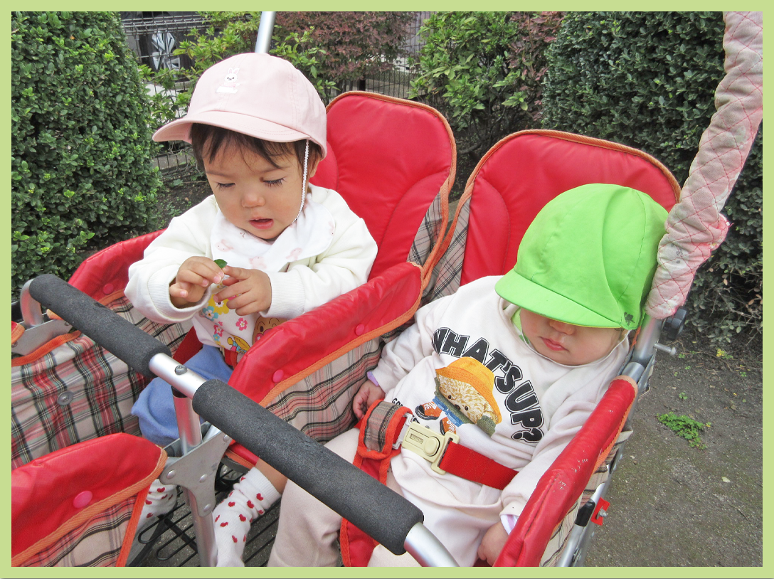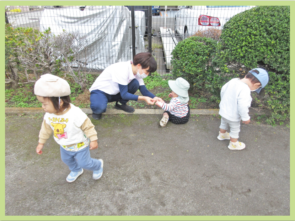 クレッセント公園までお散歩に行きました。お散歩に行く前にお名前を呼んで元気にお返事をして出発!公園に着くと声を出して喜んでいました。駆け回ったり、バギーに乗って探索をしたり、思い思いにお散歩を楽しむことができました。