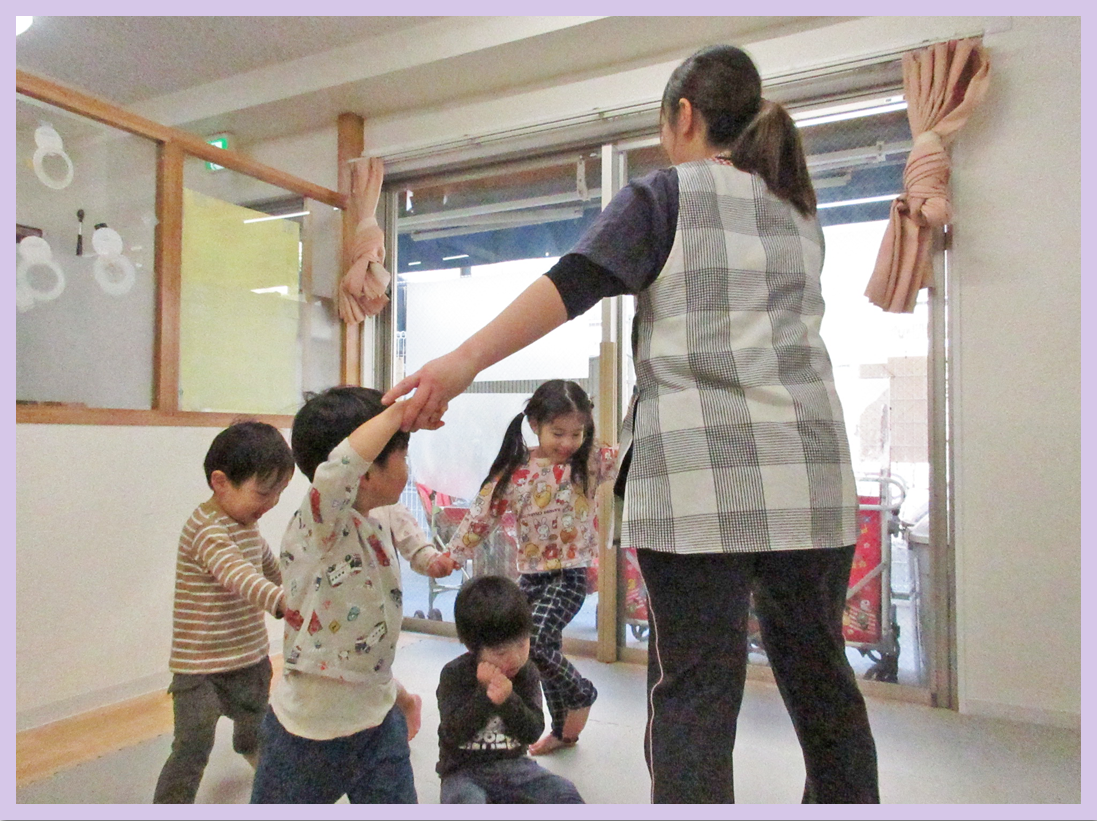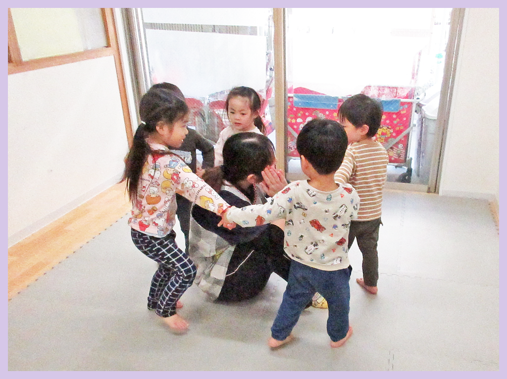 クマが寝ている周りを、手を繋いで歩くのですが、元気いっぱい歌を歌いながら歩く姿がとても可愛らしかったです♪