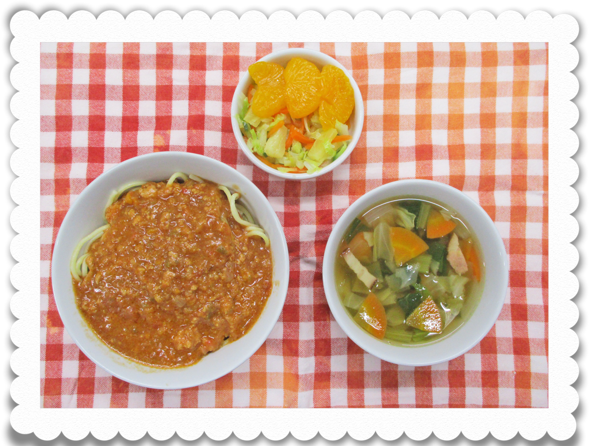 【乳児給食】スパゲティミートソース、ハワイ風サラダ、ベジタブルスープ