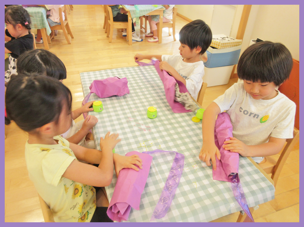 10月の芋掘りに向けてそら組とたいよう組でどのくらい大きなさつまいもが育っているのかさつまいもがどんなふうにして土の中にいるのかを、想像しながらさつまいもを作ったり、いもほりごっこを楽しんだりしました。