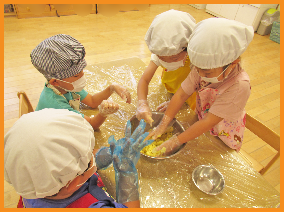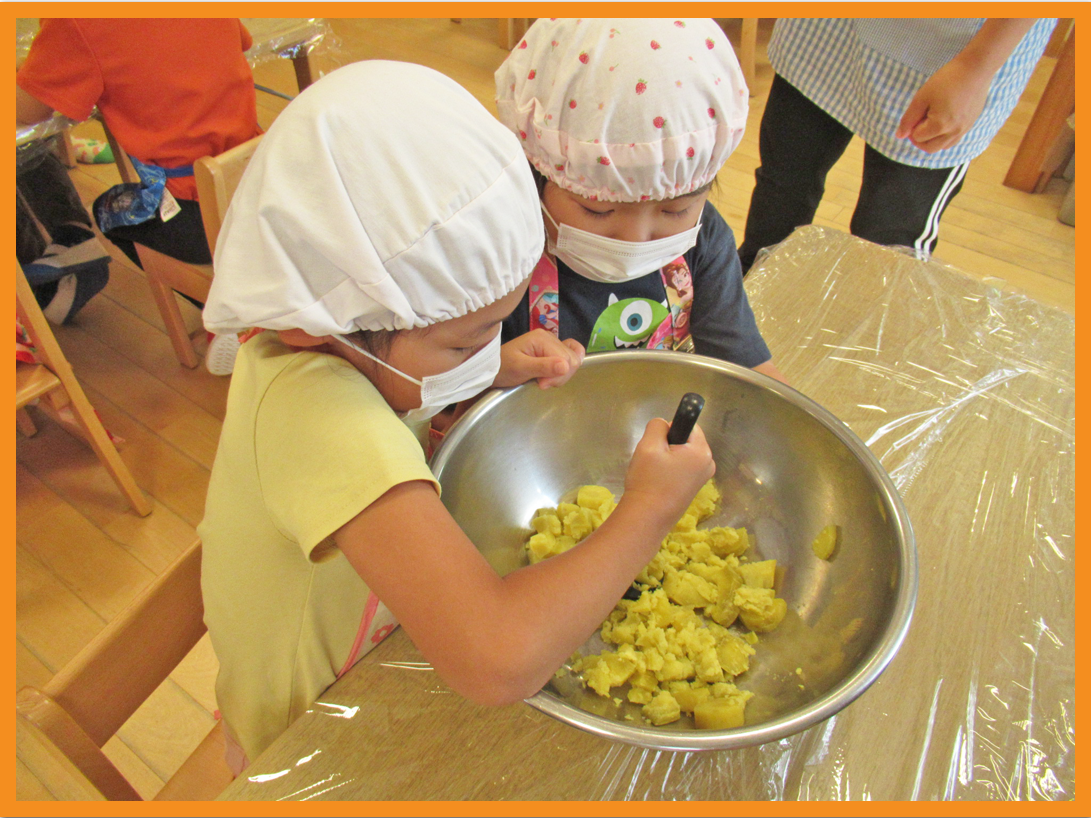 今回、芋ほり遠足で収穫したサツマイモを使って「いももち」を作りました。まずは、マッシャーを使ってサツマイモをつぶしていきました。1人がボールを持ってもう1人がつぶしていく連携プレーをとるこどもたちでした。細かくつぶした後は、米粉や塩を入れて手で混ぜていきました。ぐにゃぐにゃの感触を楽しみながら混ぜていき、最後に自分たちの好きな形に作っていきました。ハートやおにぎりの形、雪だるまのように立体に作る子もいました。