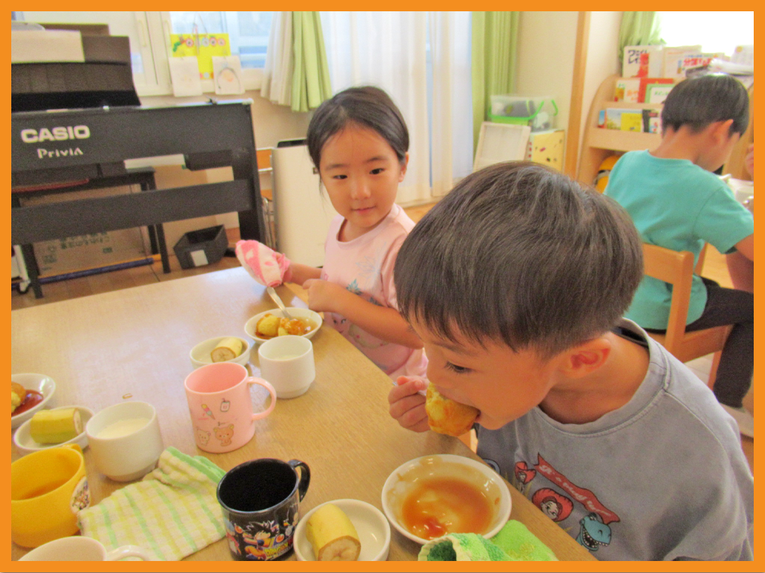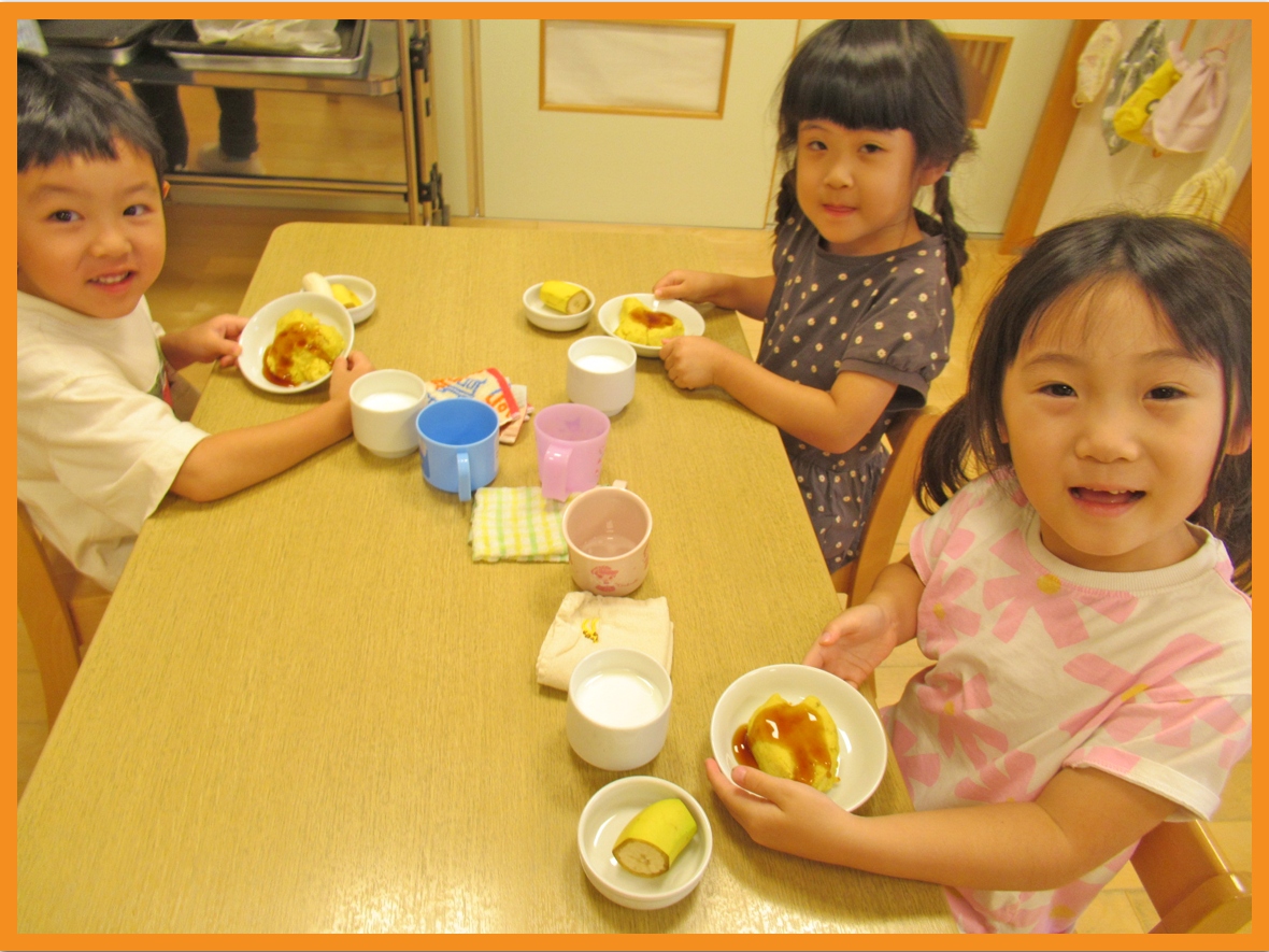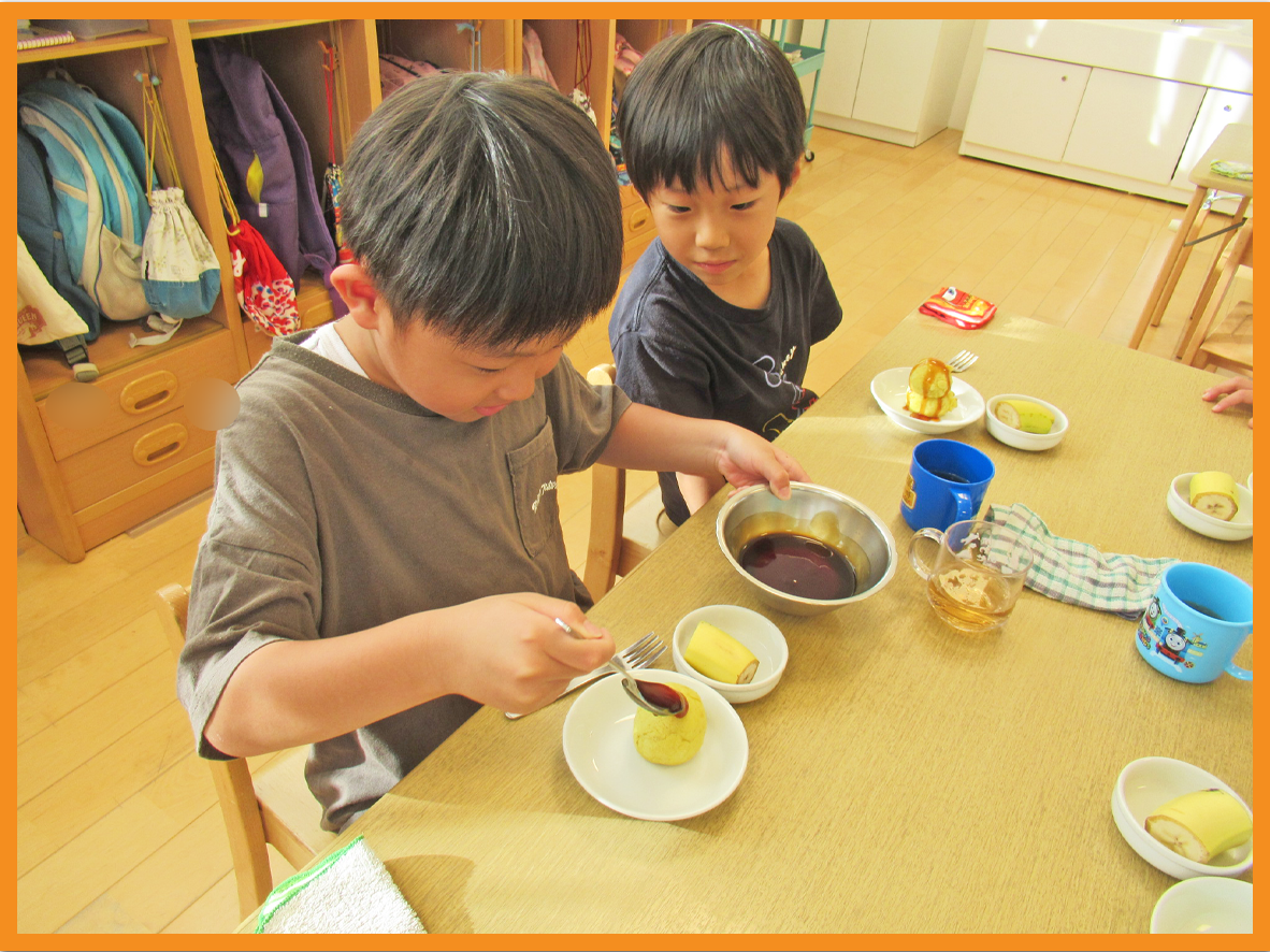 完成したいももちはおやつで食べました。蜜は自分の好きな量をかけました。「どのくらいかける?」「もっとかけようかな」と楽しみながらたくさんかけていました。