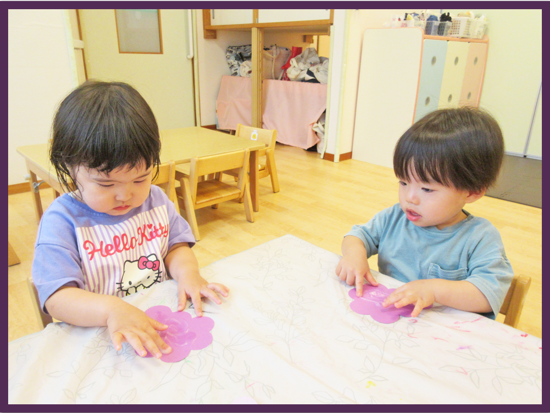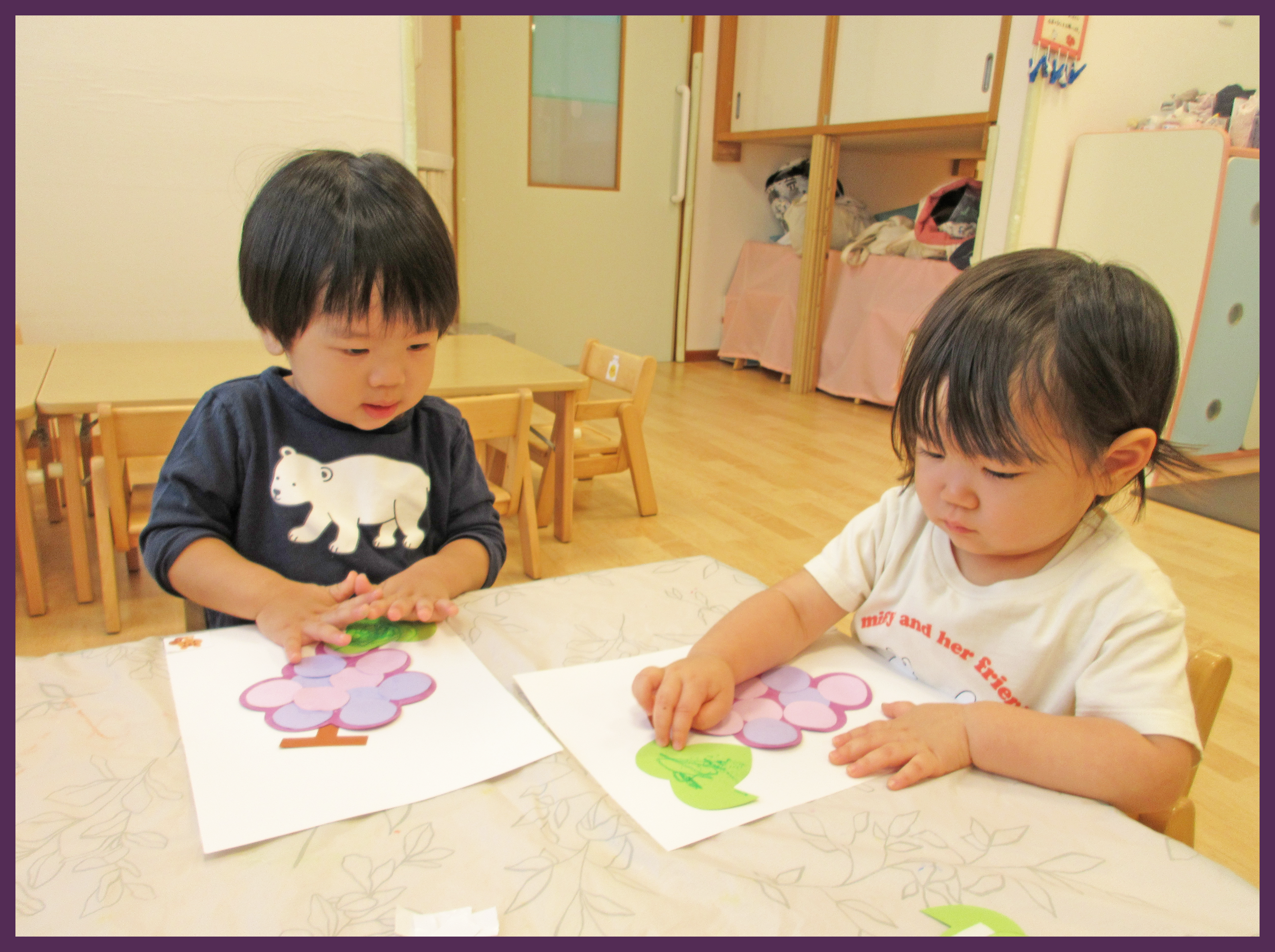「ここ」「ぺったん」などと言いながら好きな場所に葉っぱを貼り付けて完成させることができました。