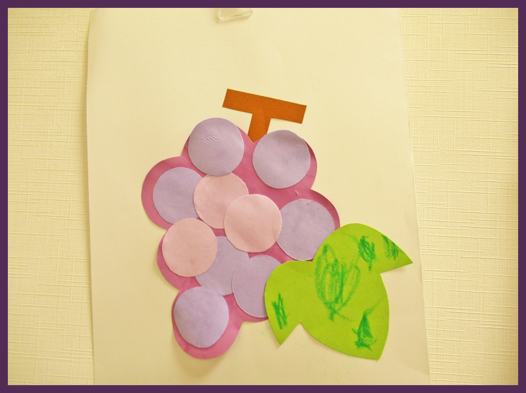 ぶどうの台紙にのりを塗り広げ、好きな場所にぶどうの実を貼り付けました。