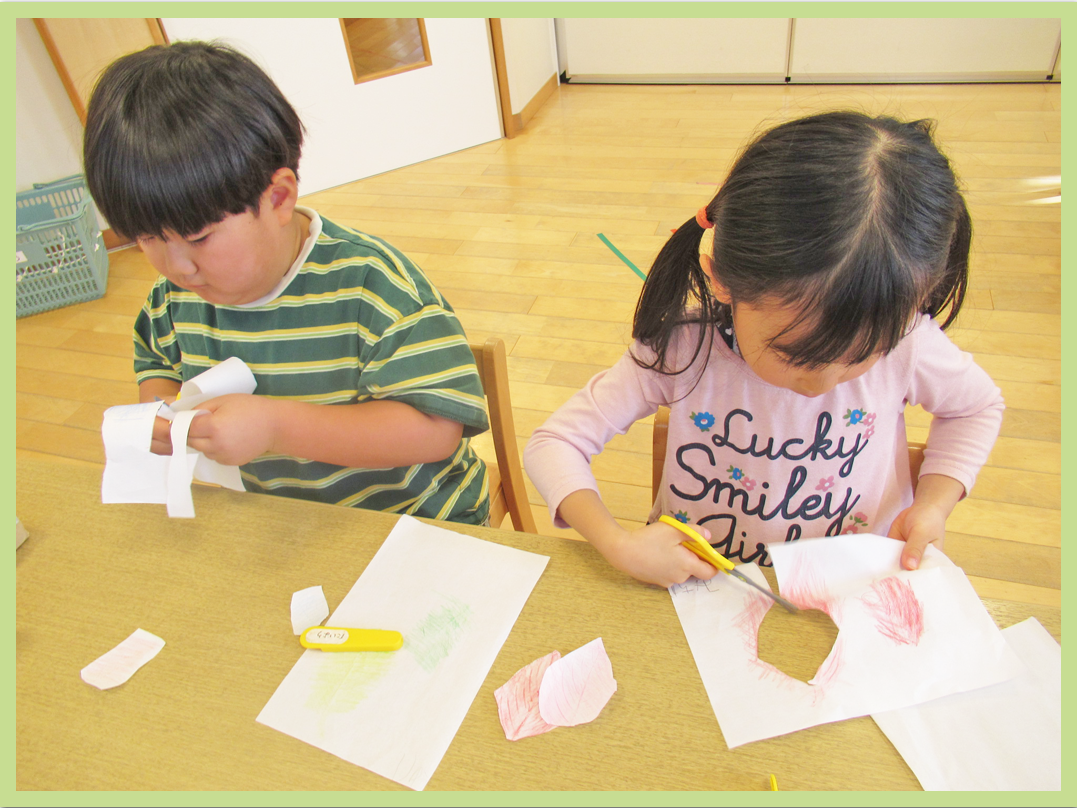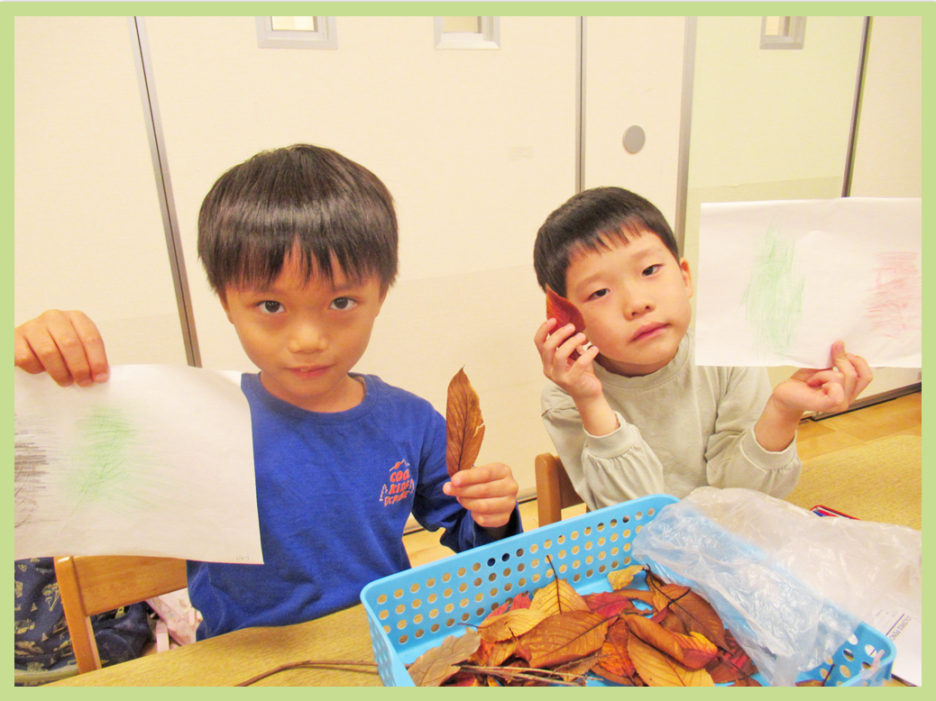 落ち葉を使ってこすり絵をしました。自然探索を通して、植物の生長に興味津々のたいようぐみですが、今回は「落ち葉」という枯れてしまった葉を「こすり絵」でキレイな葉に再生させました。