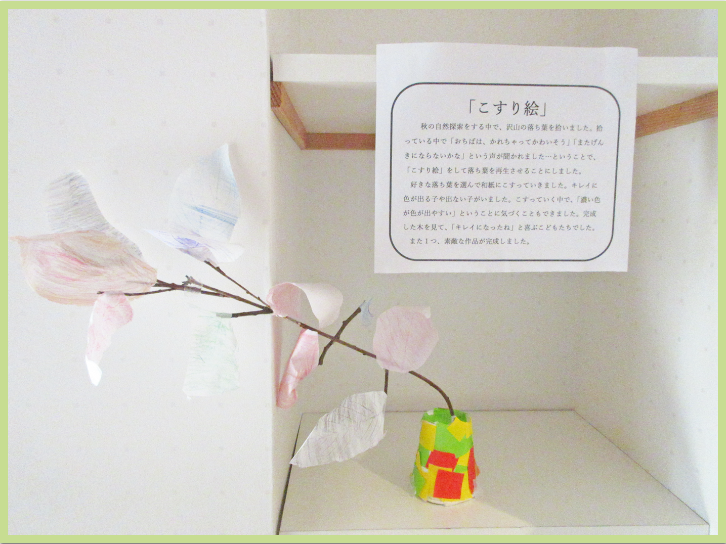 枯れた落ち葉でこすり絵をすると、ぼろぼろになりやすく苦戦する様子がありましたが、「斜めにこするとキレイにできるよ」「ここ押さえるから一緒にやろう」などと、友だちと協力して「こすり絵」を完成させることができました。最後に、枯れた枝に貼り付けて完成です。