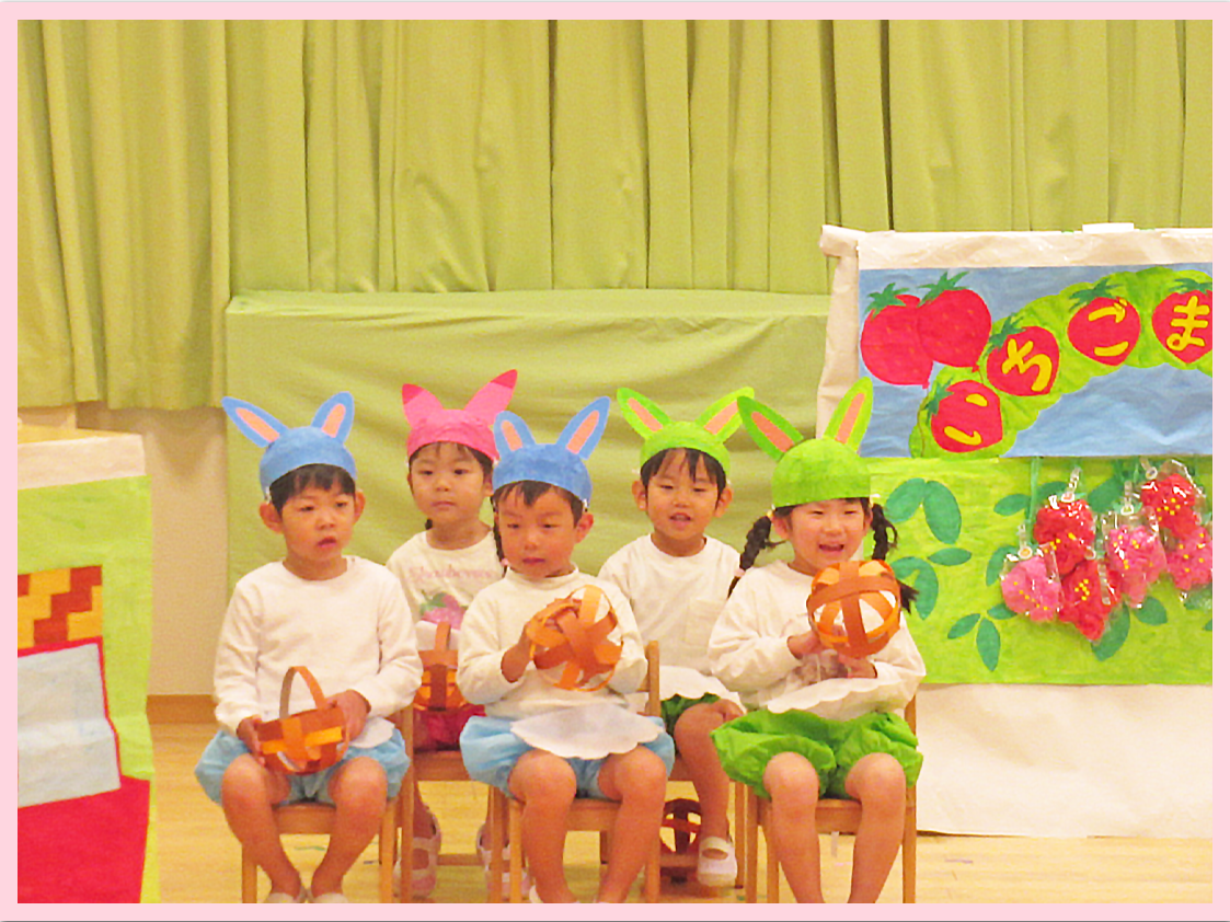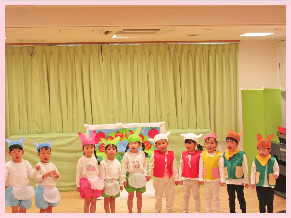3歳児もり組では劇「むつつごうさぎのきっさてん」合唱「たのしいね」を披露しました。初めての劇遊びに当日は緊張しながらも自分の台詞をしっかり話していました。合唱では緊張も徐々にとれ、振付をつけながら歌の題目同様、笑顔で歌うことができました。