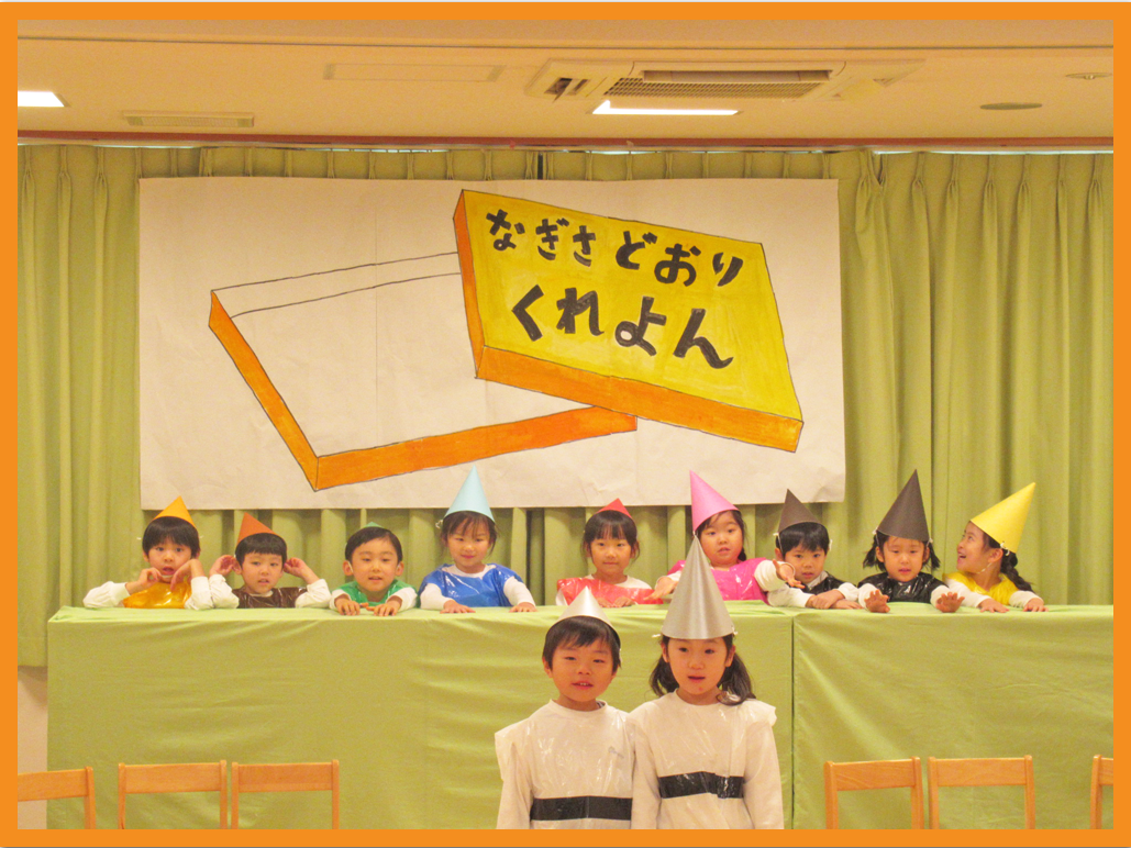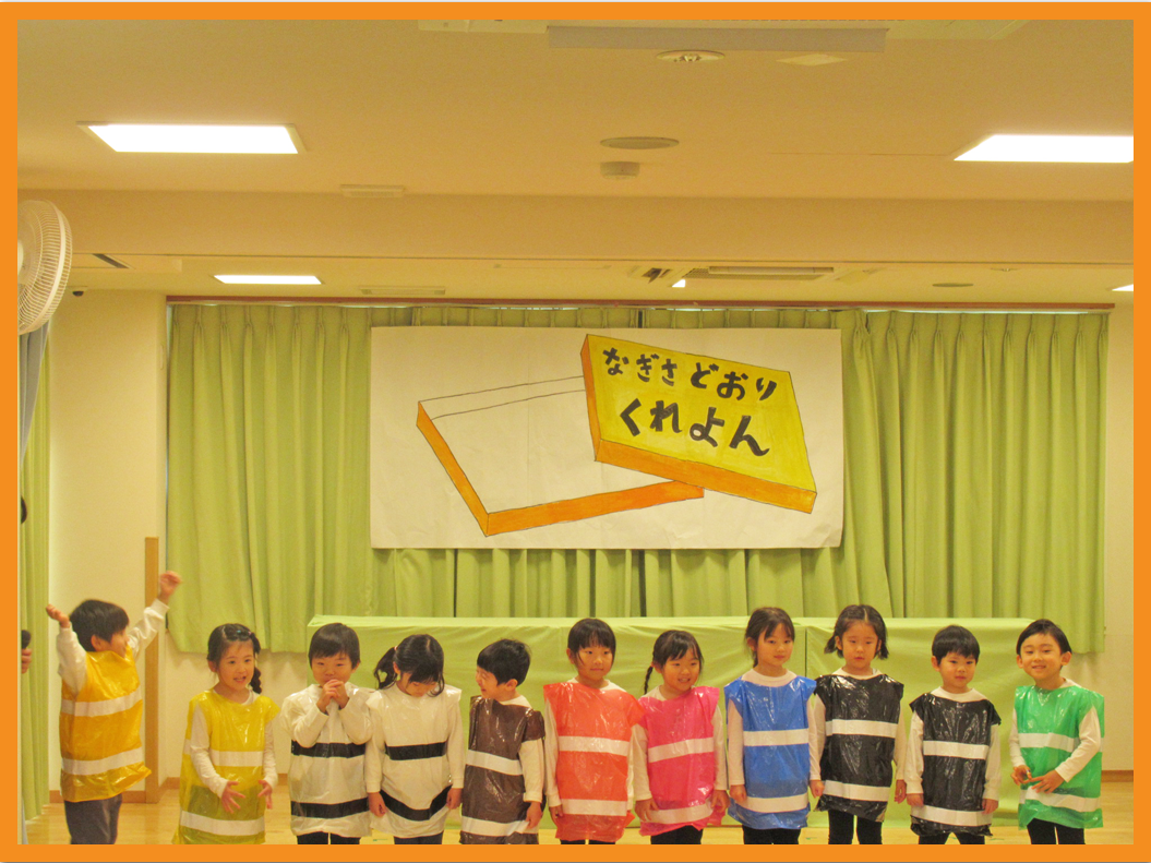 4歳児そら組では劇「くれよんのくろくん」、合唱「きみイロ」を披露しました。こどもたちが大好きな絵本が題材ということもあり、自分たちで台本を開いて友だちと台詞を話す練習をしたり、背景やくれよんが描く絵を全部自分たちで準備したりしながら本番を迎えました。当日は緊張しながらも友だちと力を合わせて演じきりました。合唱ではみんなで声を合わせ元気に歌っていました。