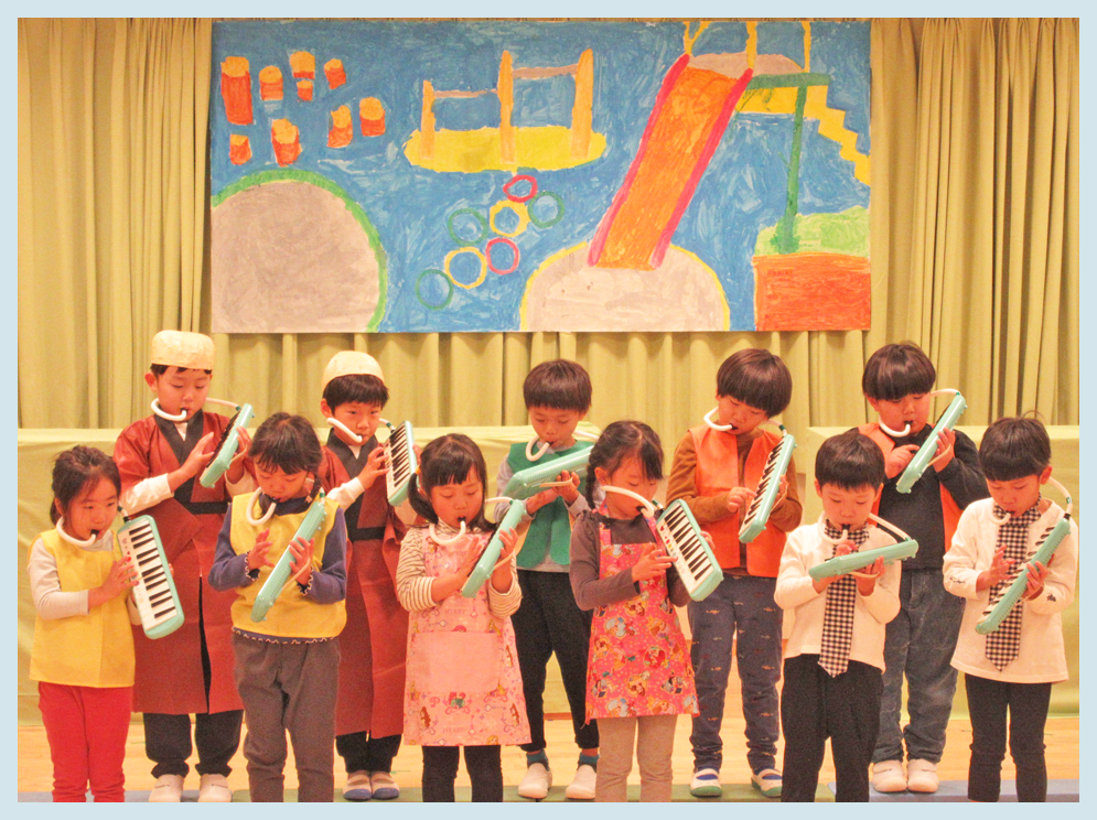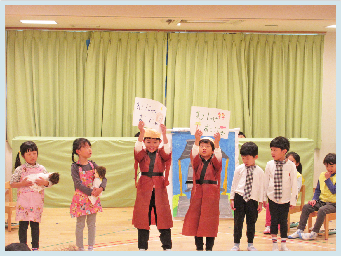 5歳児たいよう組では、劇「じゅげむ」、合唱「青い空に絵をかこう」、鍵盤ハーモニカ「よろこびのうた」を披露しました。劇は台詞に合わせて声や表情を変えたり、身振りを自分で考えたりしながらそれぞれの役を演じていました。場面展開もこどもたちが行い、さすが年長さんと思わせてくれる姿を見せてくれました。鍵盤ハーモニカではみんなで音を合わせて、合唱では掛け声を合わせて、気持ちを一つに発表することができました。