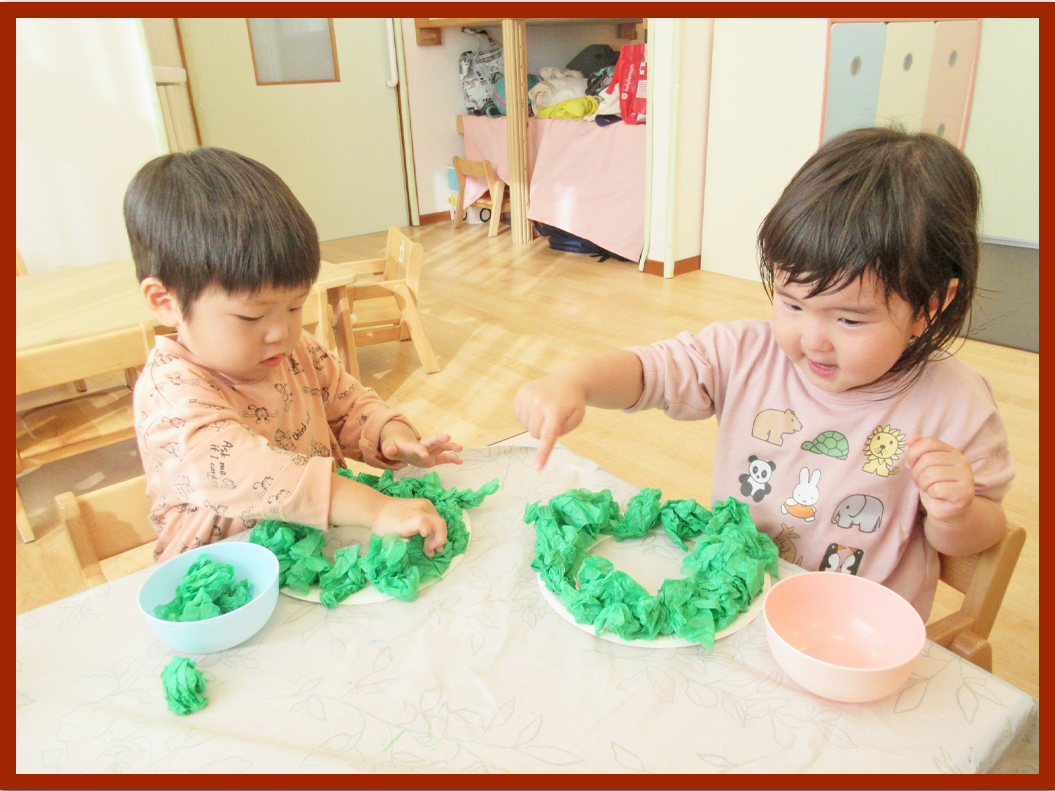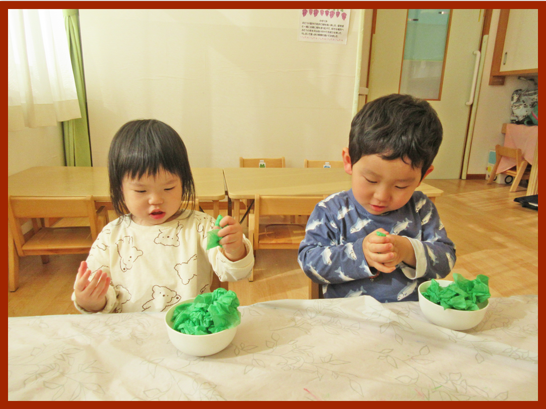 最初に、緑色の花紙を丸めます。「ぎゅっぎゅ」と言いながら、丸めることを楽しむ姿が見られました。