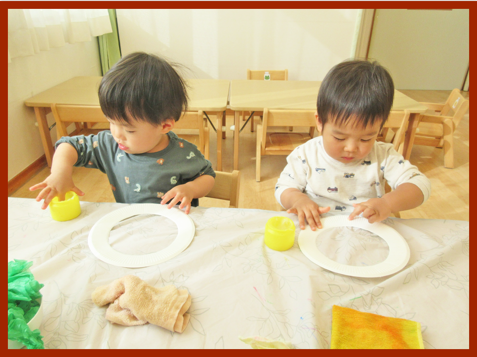 丸めた花紙を紙皿に貼り付けます。紙皿が緑色になっていく様子をみて、「みどりだよ」「いっぱいつけた」とお話する姿が見られました。