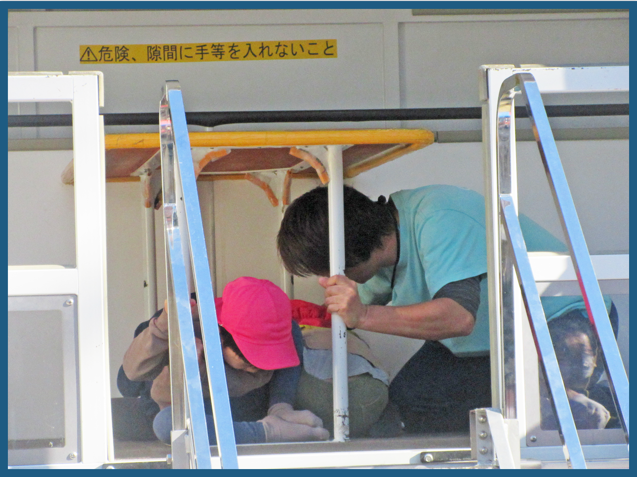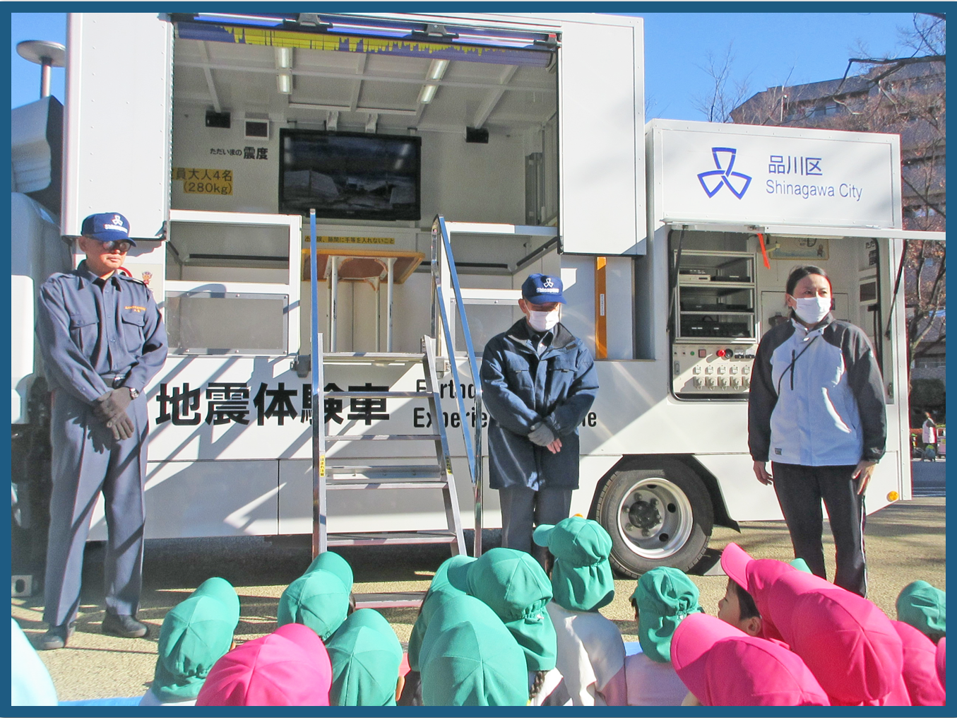 品川区役所の防災課の方に体験の仕方を聞き、職員と4.5歳児のこども達が順番に地震の体験をしました