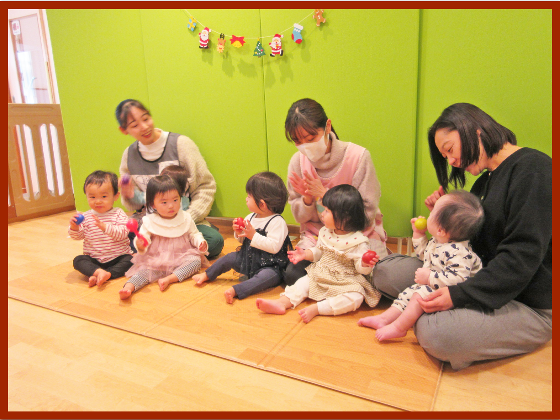0歳児クラスは、マラカスを持って「赤鼻のトナカイ」を歌いました。音楽に合わせてマラカスを振ることを楽しんでいました。