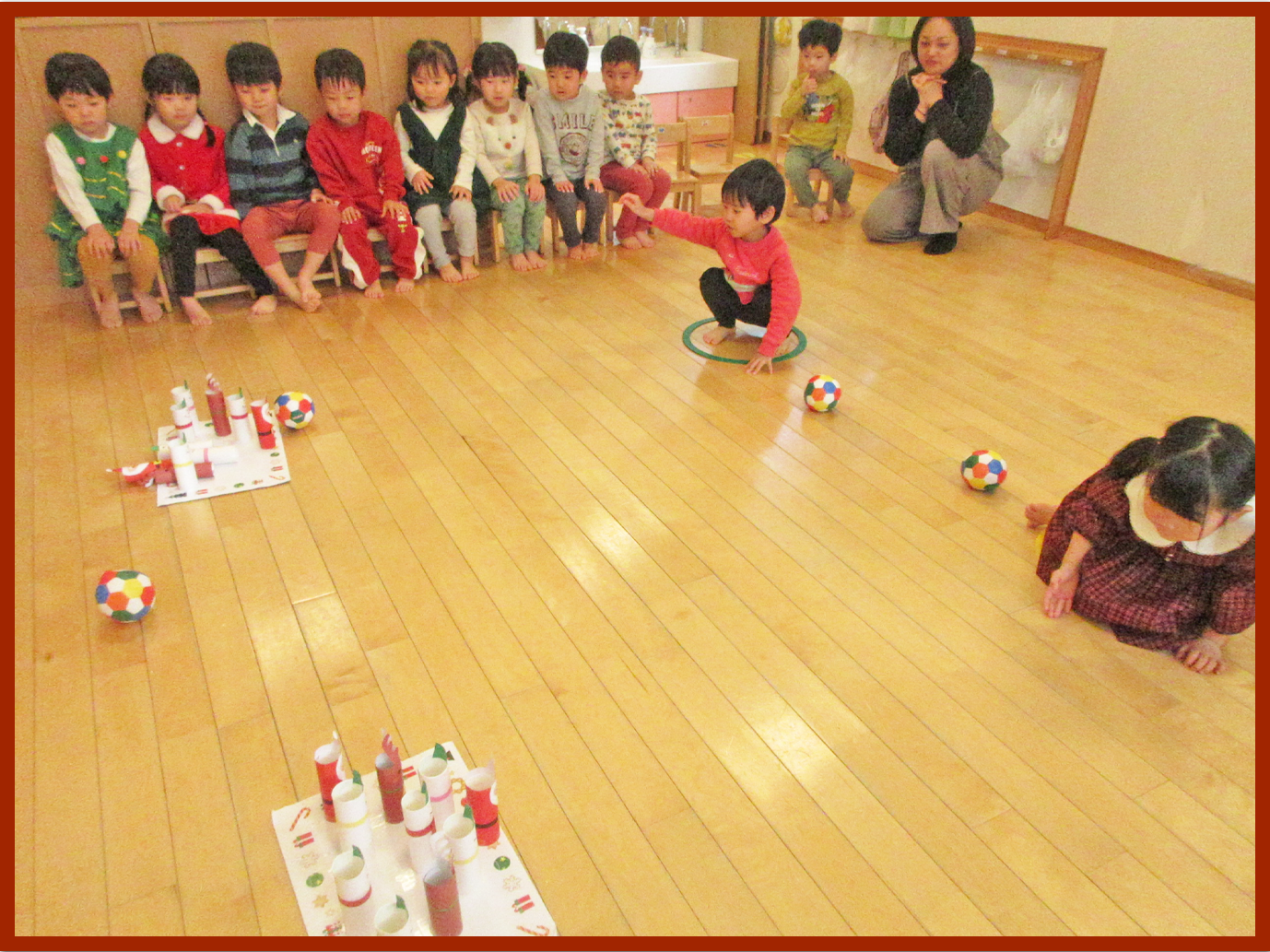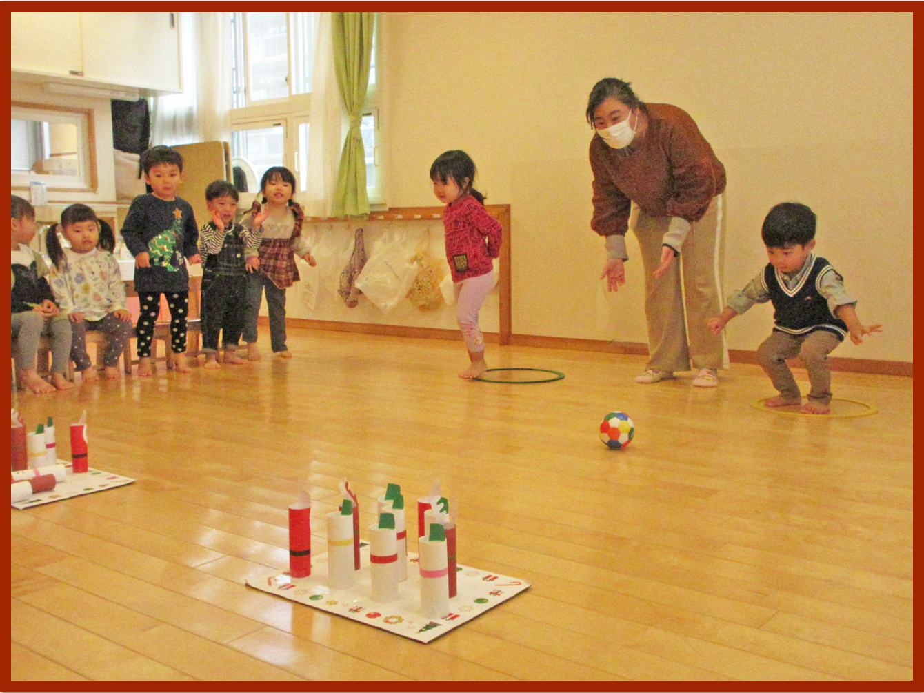 2歳児クラス、3歳児クラスはゆきだるまのボーリングを行いました。ボールを転がし、ピンを倒すことができると、嬉しそうに笑顔を浮かべていました。