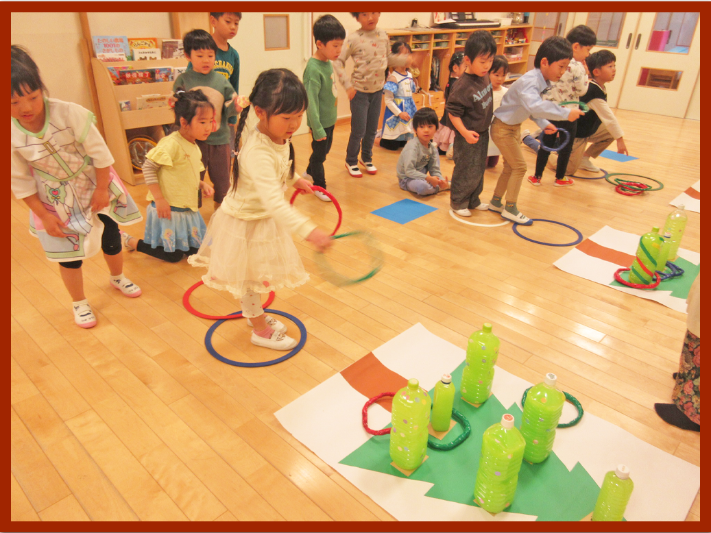 4歳児クラス、5歳児クラスは手作りのわなげで遊びました。