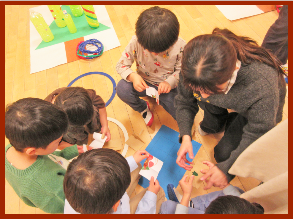 わなげの下にパズルのピースが隠れており、お友だちと協力してすべてのピースを集めることを楽しんでいました。クリスマスのイラストが完成すると、「やったー、できたよ」と嬉しそうにお話していました。