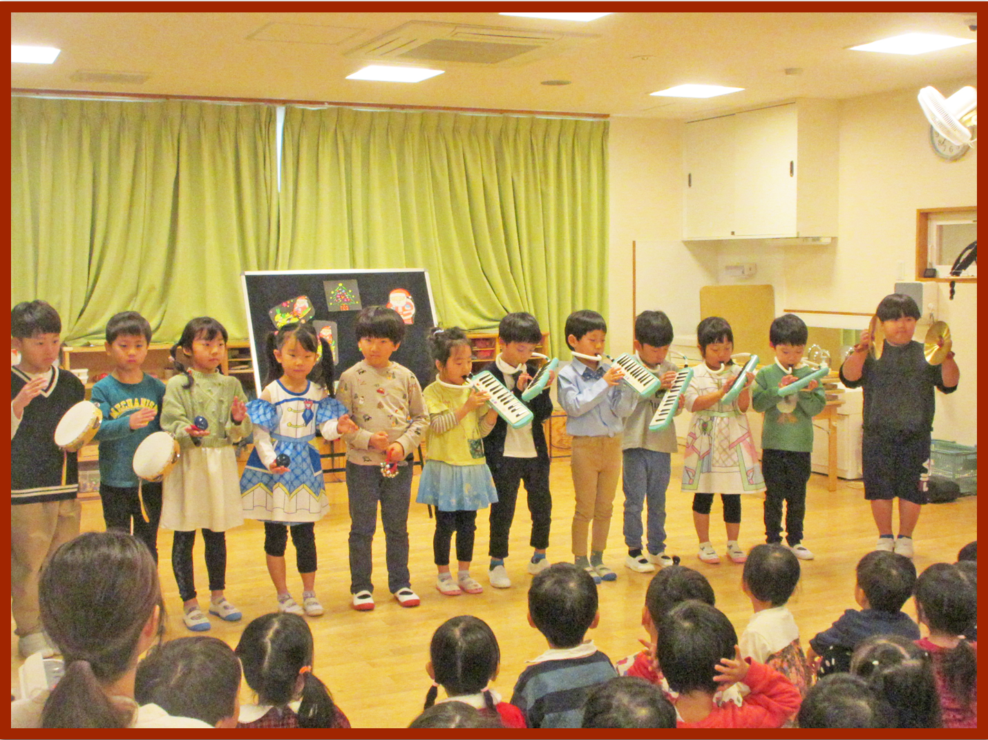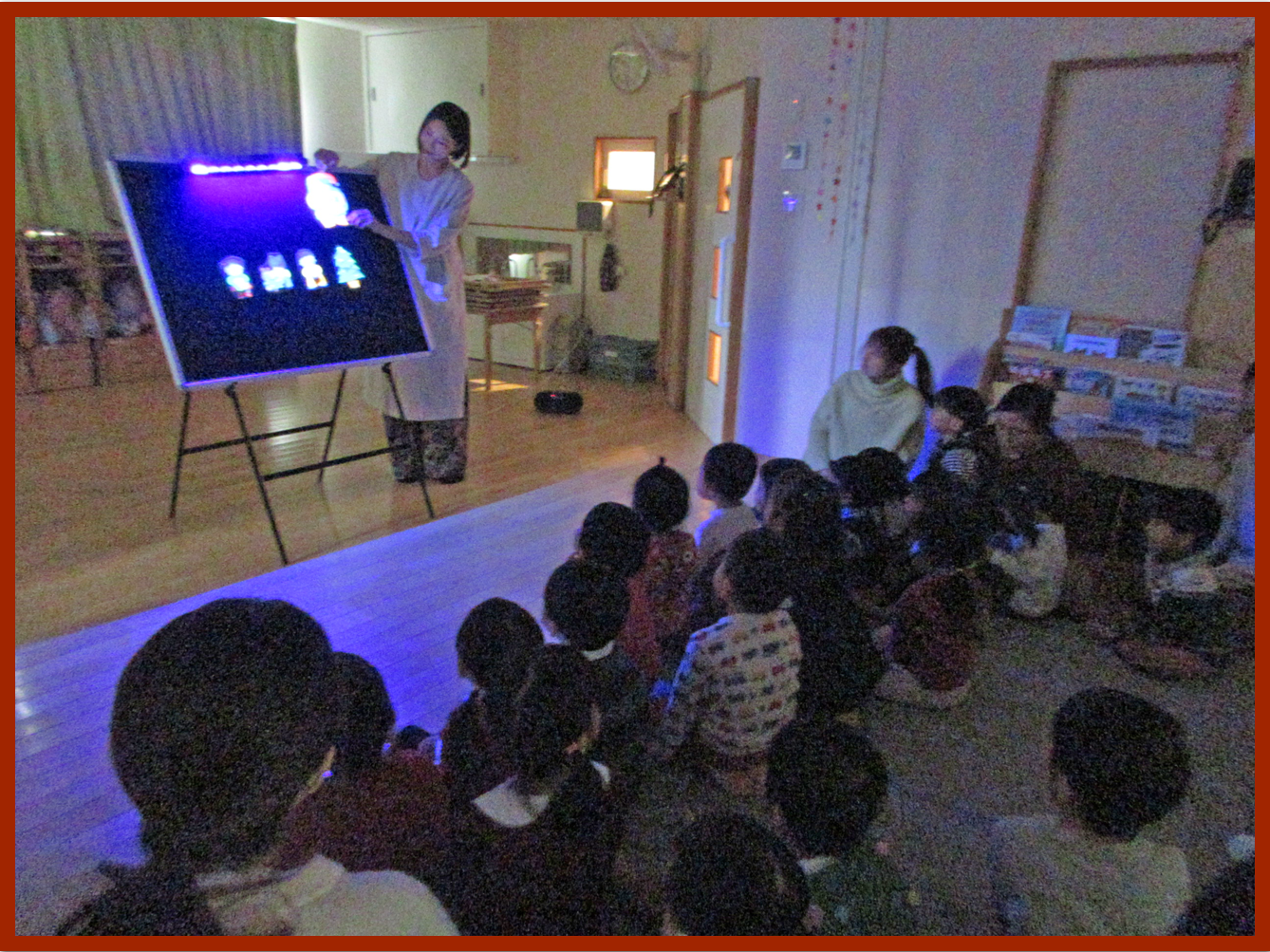 全体会では2歳児から5歳児クラスが集まり、ブラックライトシアターを見たり、たいよう組さんが合奏を披露してくれたりと、とても盛り上がりました。