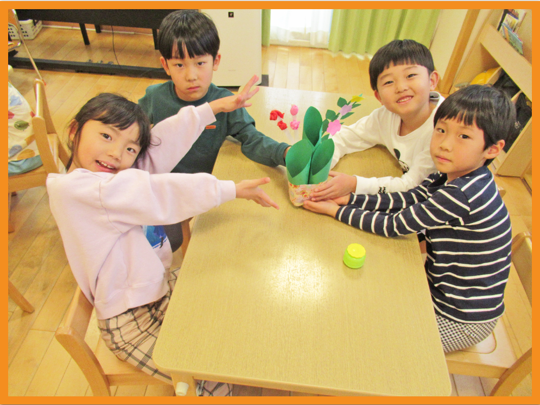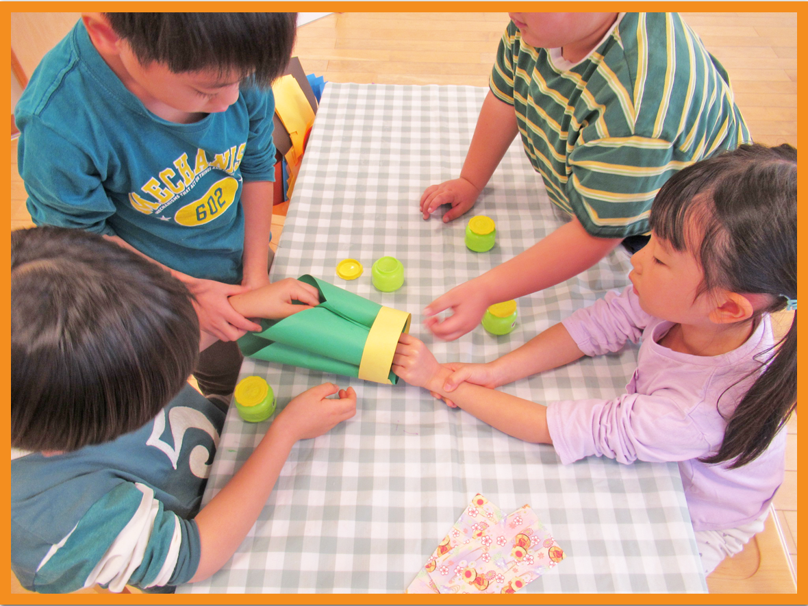 今回、たいよう組は正月の製作で「門松」を作りました。みんなでお正月の話をして色々なことを思い出す中で、「かどまつ?」とイメージが湧かなかった子も門松の写真を見ると「あっそれみたことあった」を思い出しました。