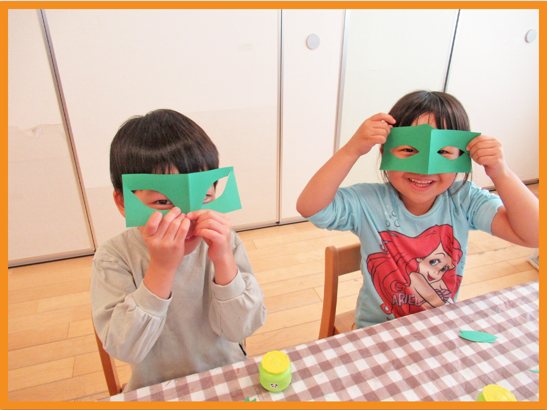 グループに分かれて、松を作ったり色々な飾りを作ったりする中で「ここはこうしたら可愛いかも」と案を出し「ここ押さえるから貼ってほしい」と協力していました。端切れでお面にするなど、見立て遊びをしながら楽しく作ることができました。