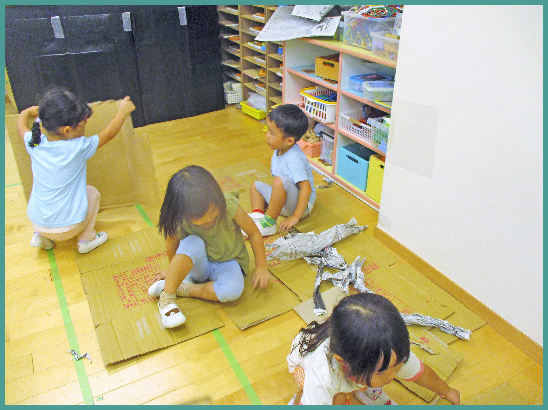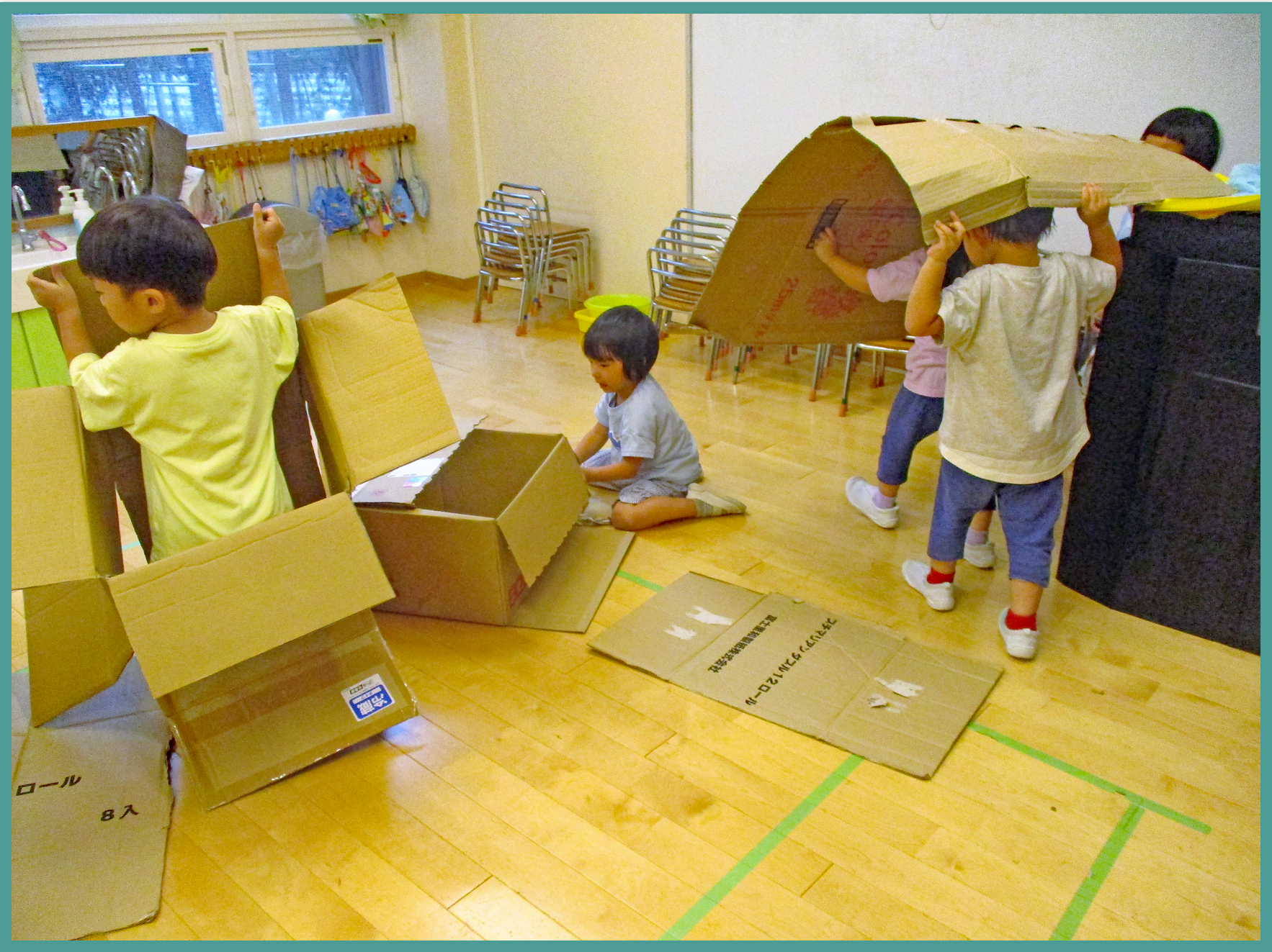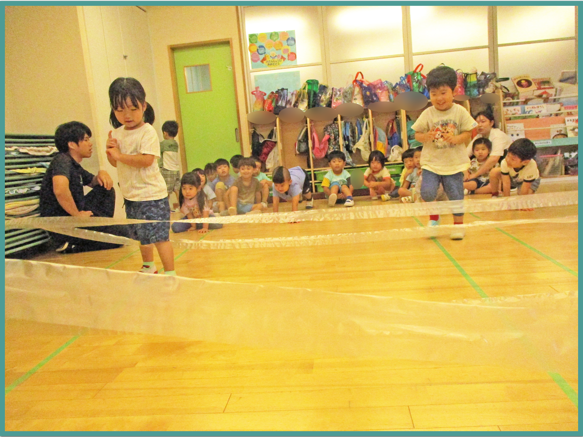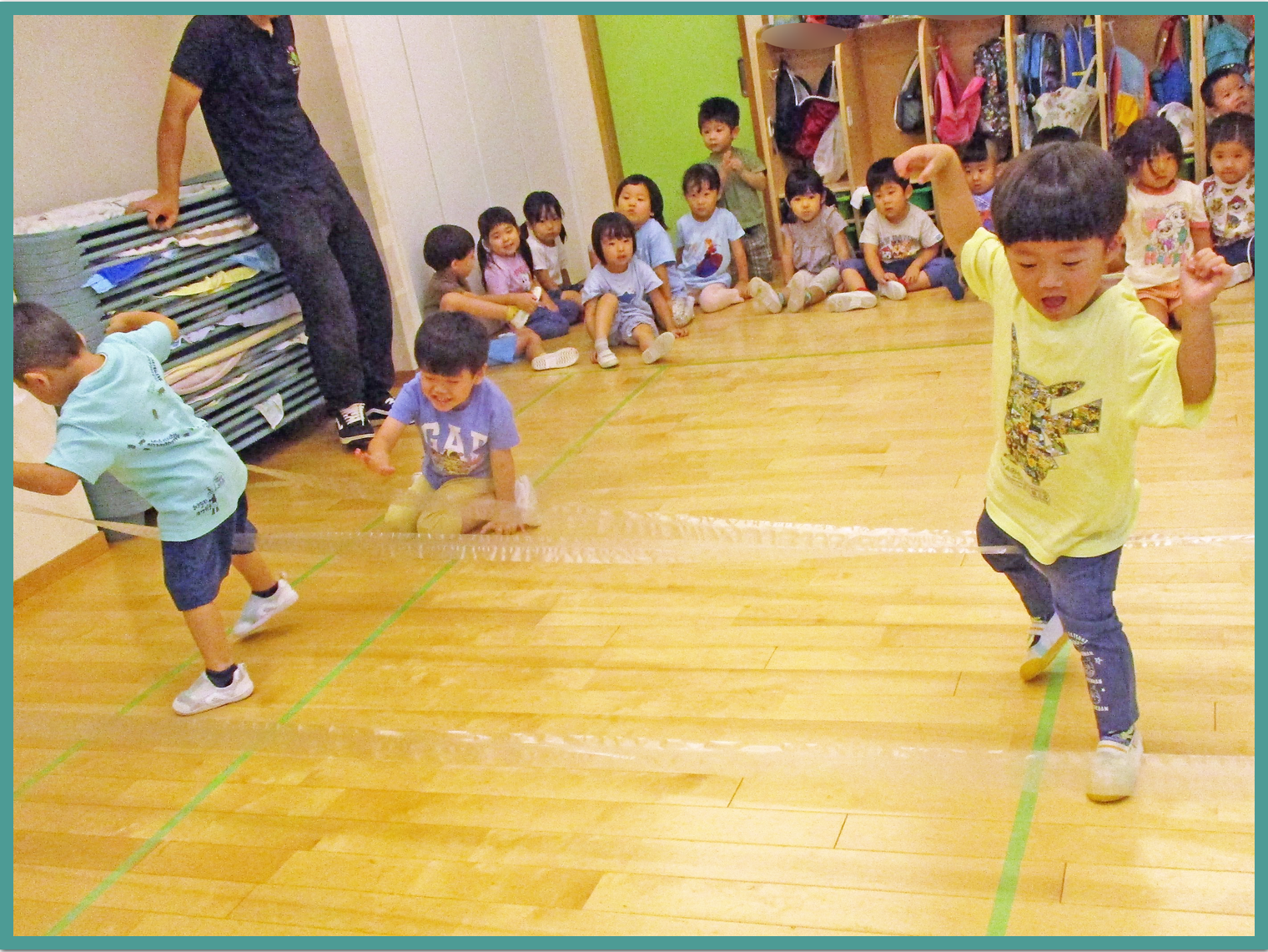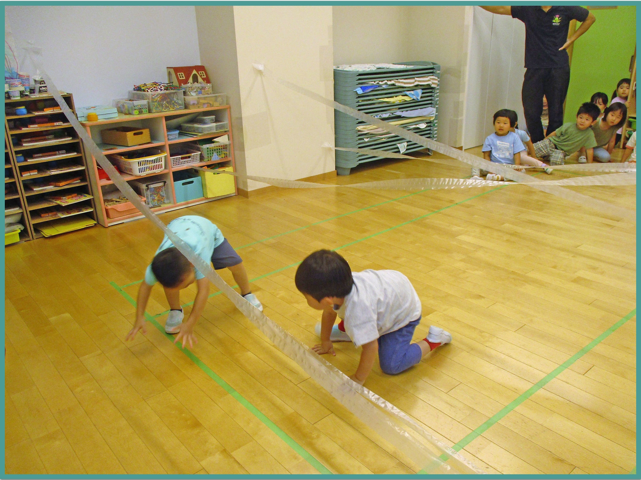 保育室に平テープを張り巡らせて当たらないようにくぐったりまたいだり