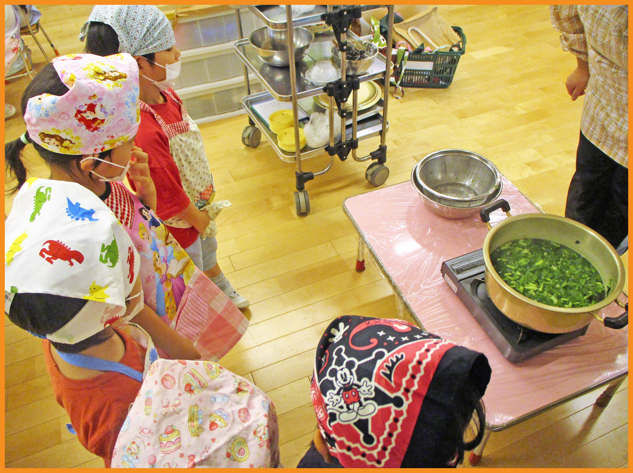ちっぎた小松菜を目の前で茹で、更に小さく柔らかくなっていく様子を見ました