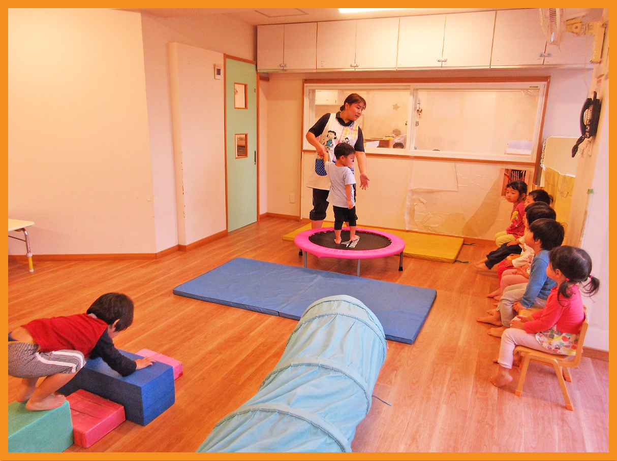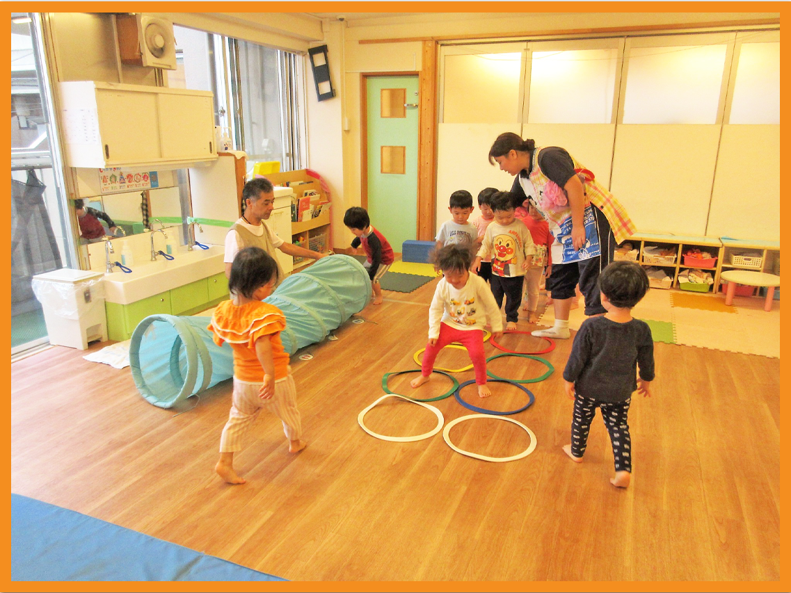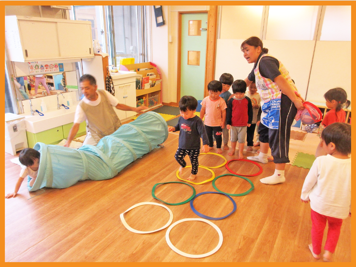 トンネル、フープ、トランポリンなどでサーキット遊びをしました