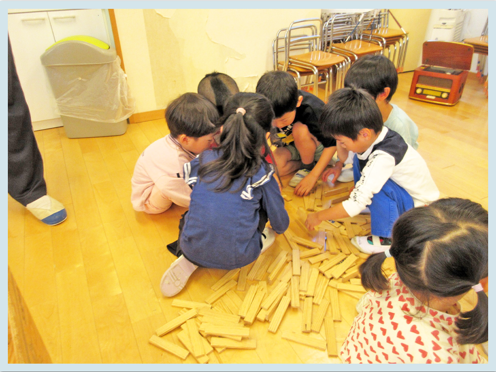 5歳児が、同じグループの子を迎えに行き、みんなで作戦会議