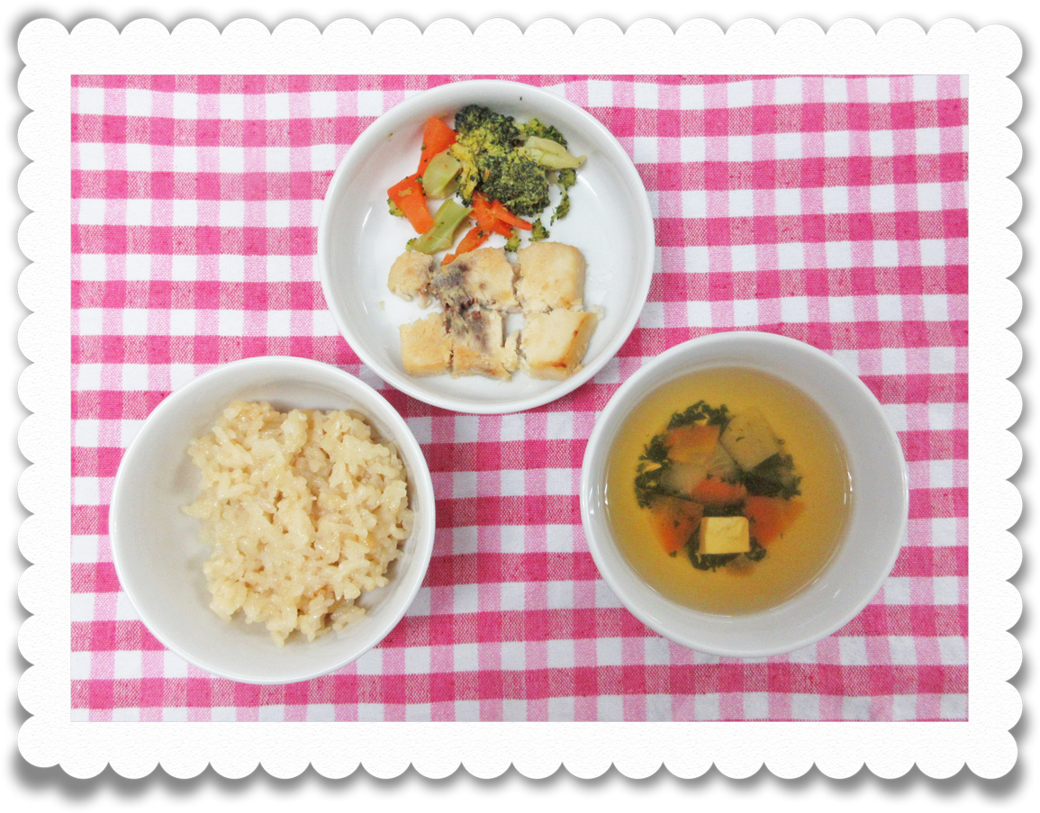 午前食:10倍粥、白身魚のペースト、キャベツと玉ねぎのうらごし、野菜スープ