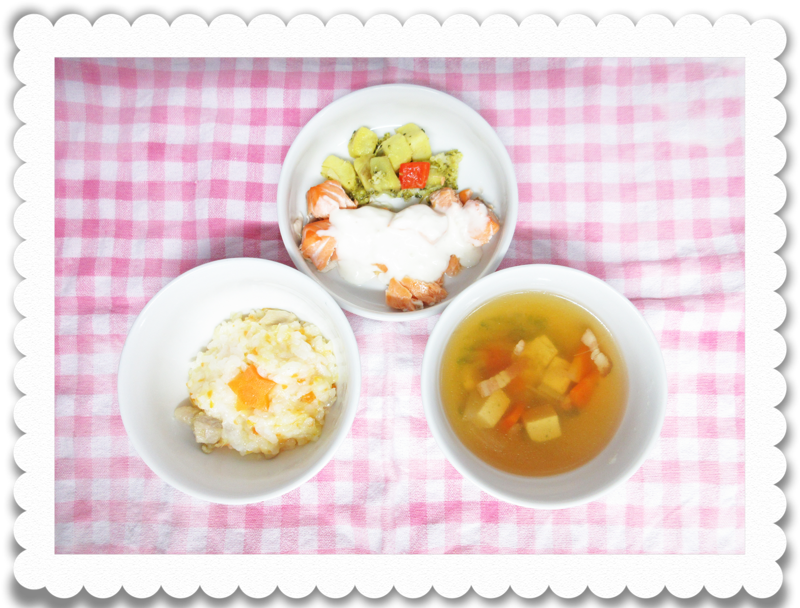 【乳児給食】リースピラフ、生鮭のマヨネーズソース、カラフルサラダ、野菜スープ