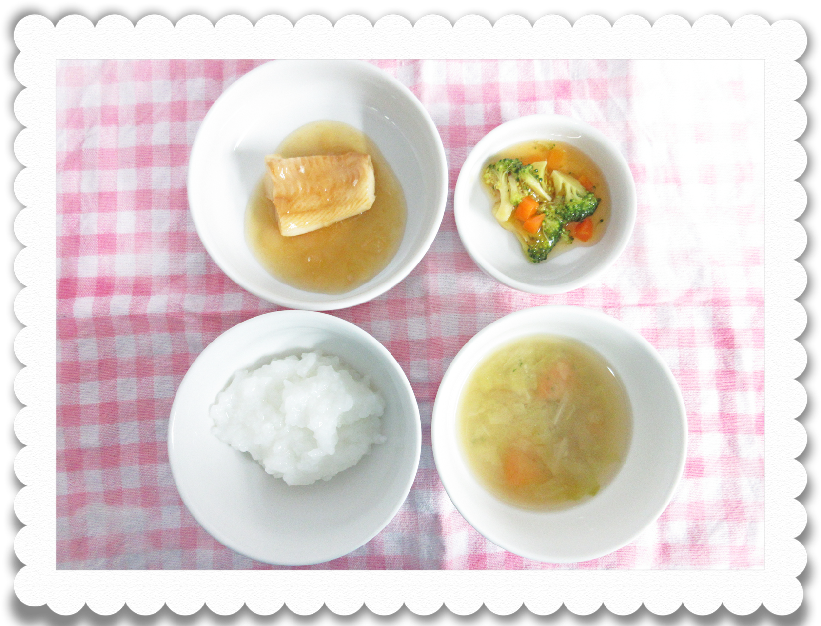 午前食:全粥、白身魚の香味ソース、ブロッコリー煮、みそ汁