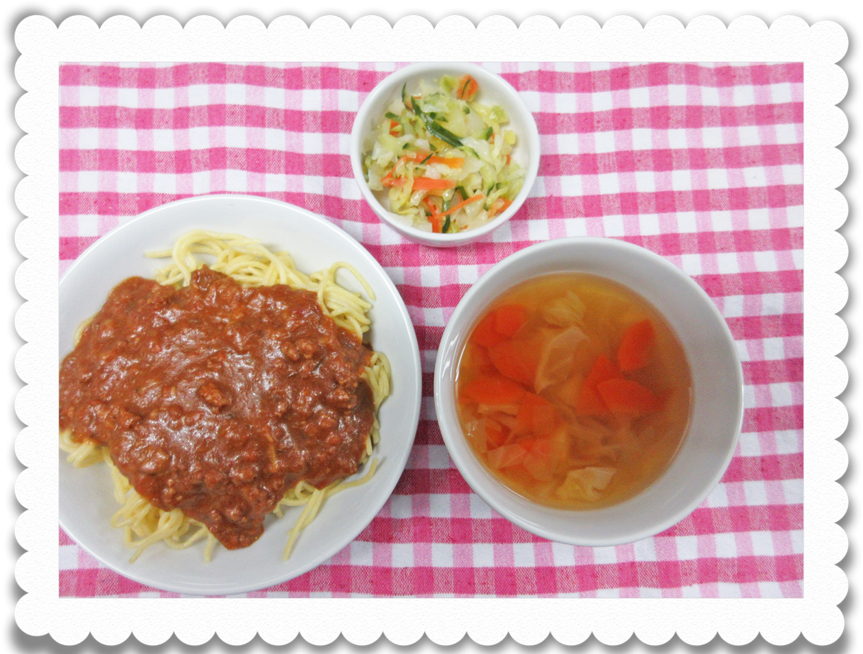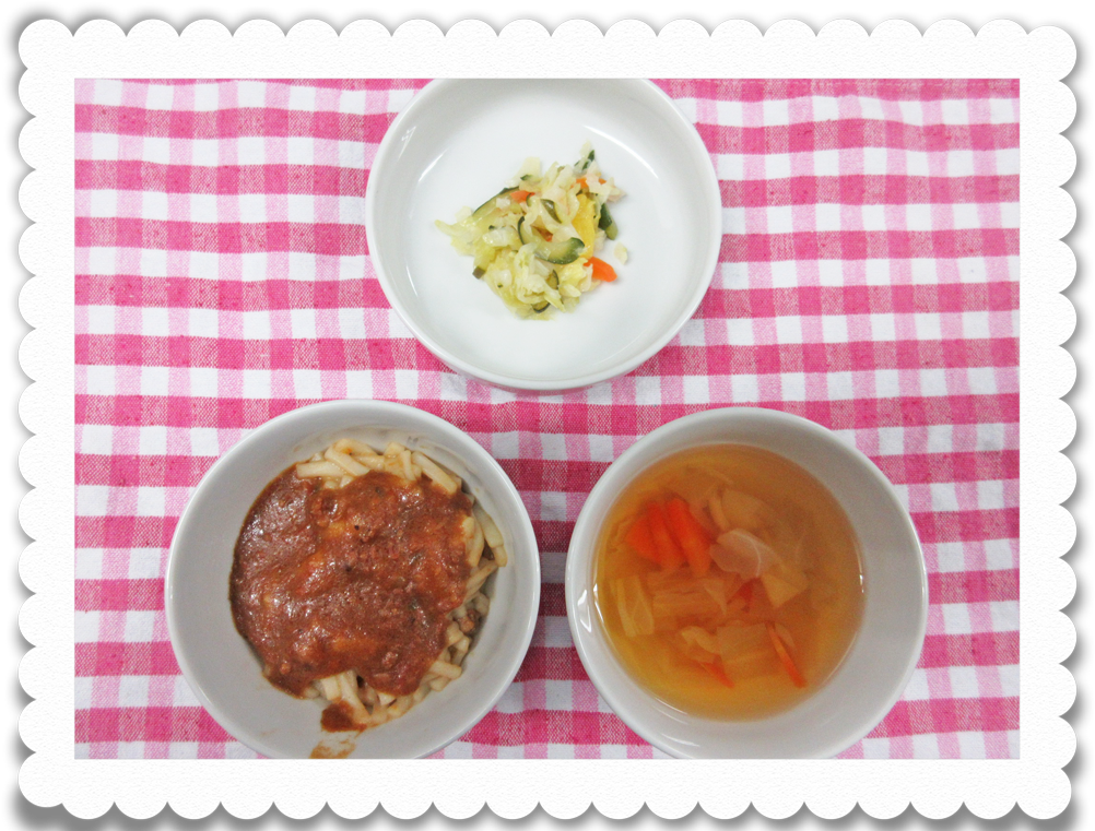 【幼児給食】スパゲティミートソース、ハワイ風サラダ、野菜スープ