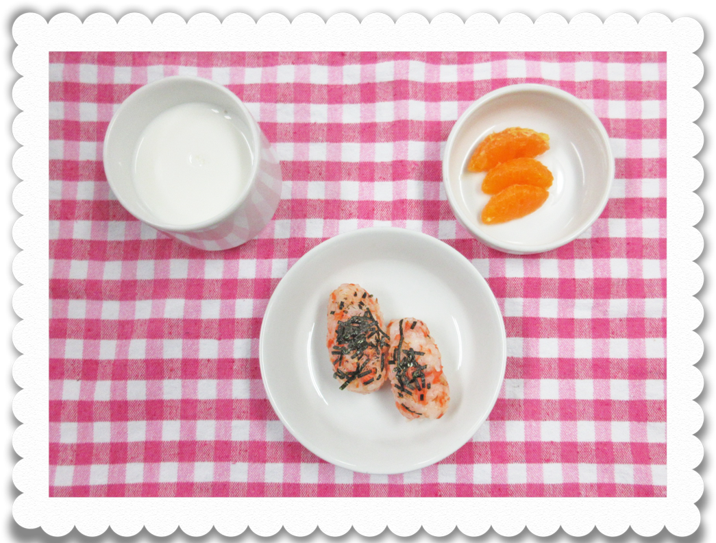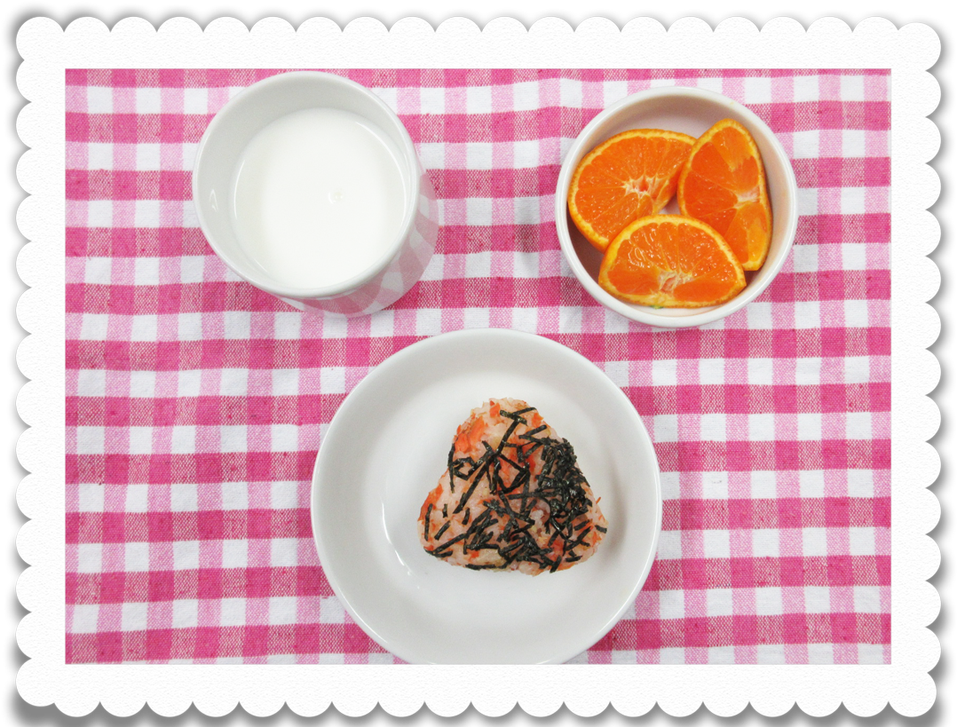 【幼児おやつ】牛乳、鮭おにぎり、果物