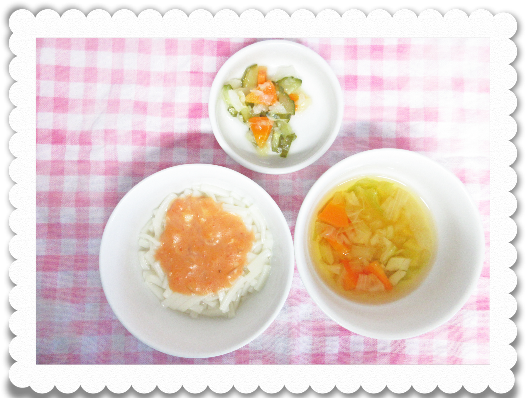 午前食:トマトミルクヌードル、おろし煮、野菜スープ