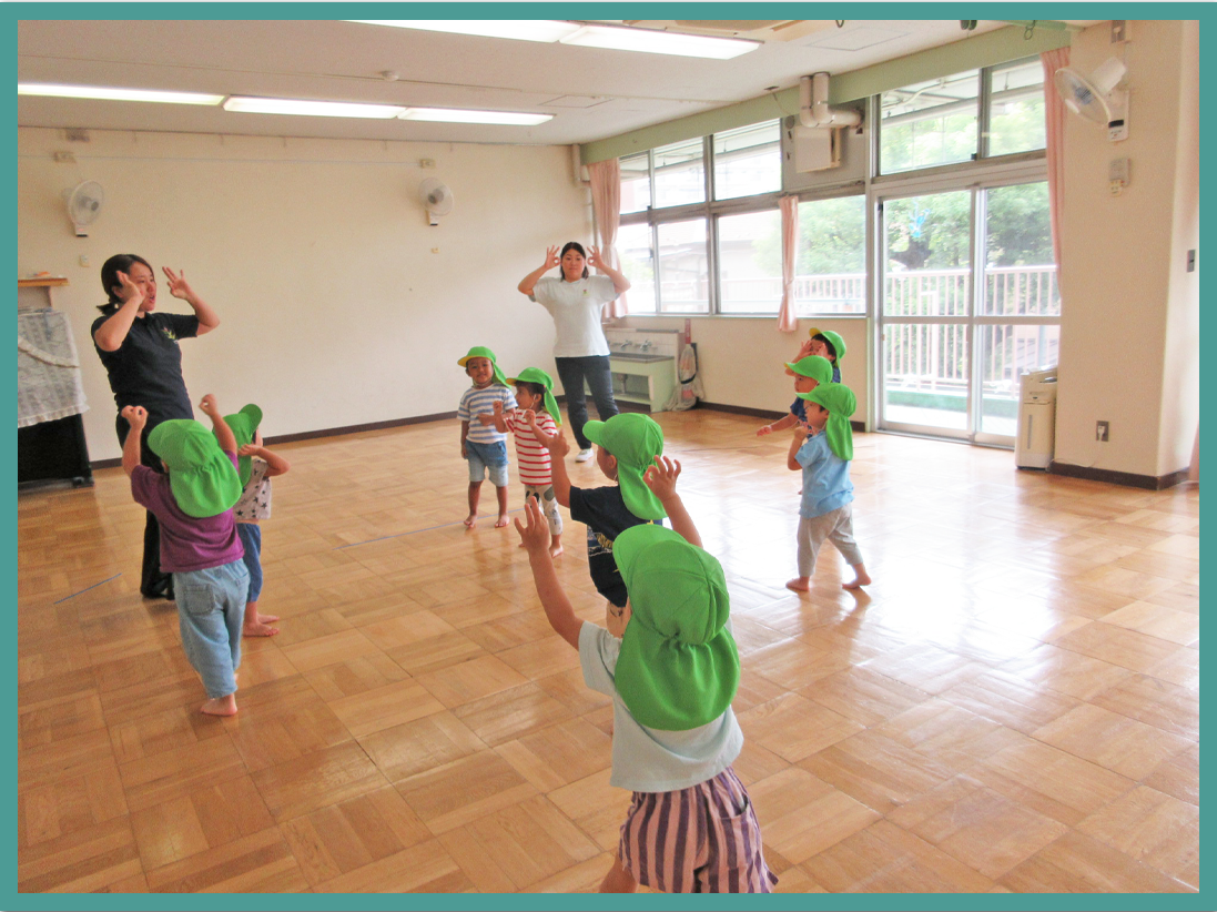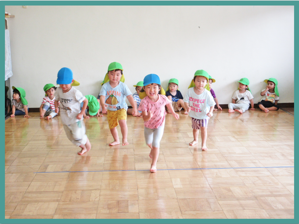 ホールでペンギンのダンスやかけっこをして体を動かして遊びました。ペンギンが「スイスイ」と泳いだり、跳んだりする動きを繰り返し楽しんだ後に、かけっこを行いました。3歳児と一緒にかけっこを行い、ゴールに立つ保育者のところまで一生懸命に走っていました。