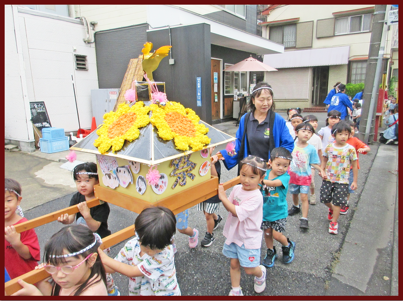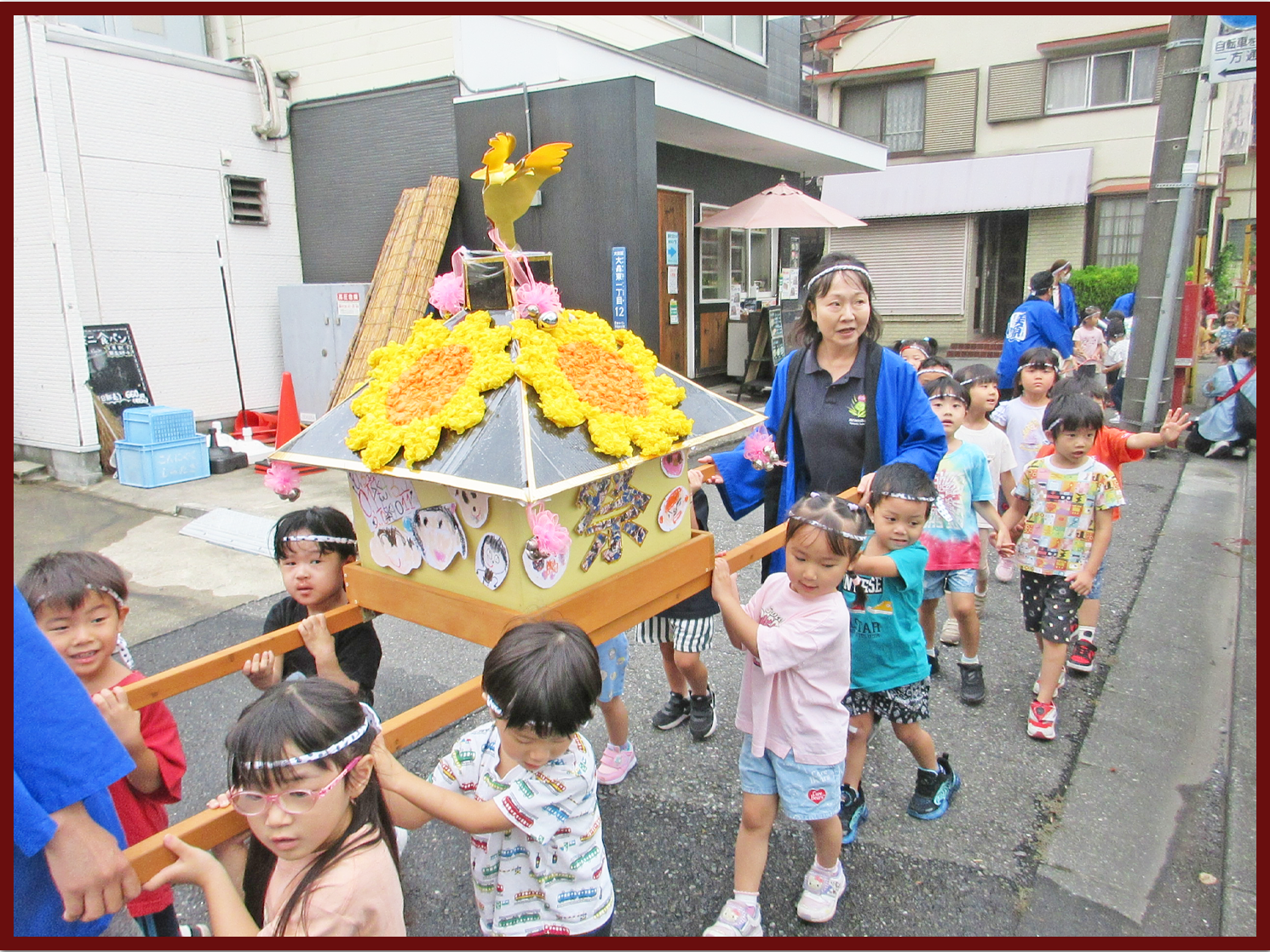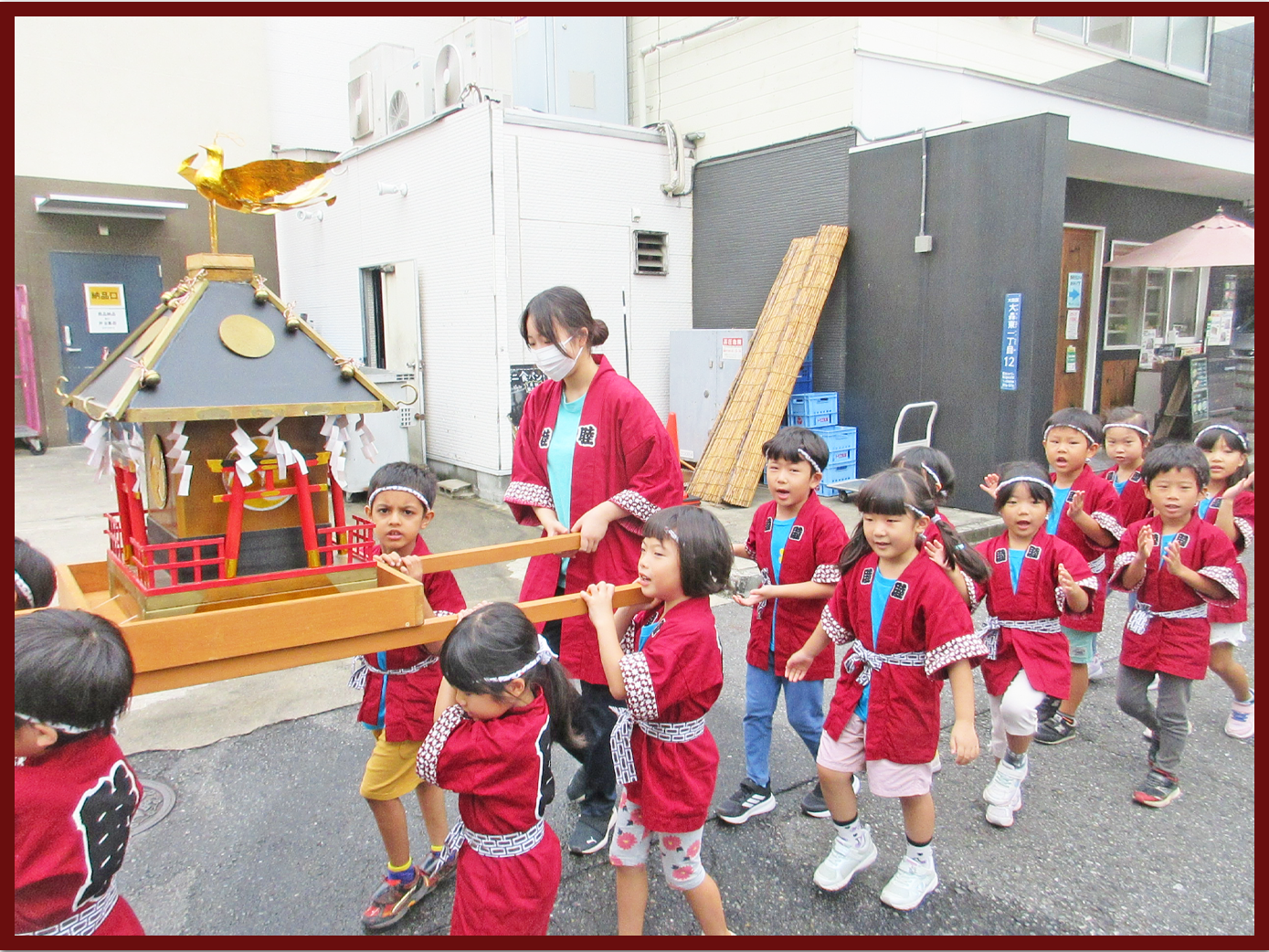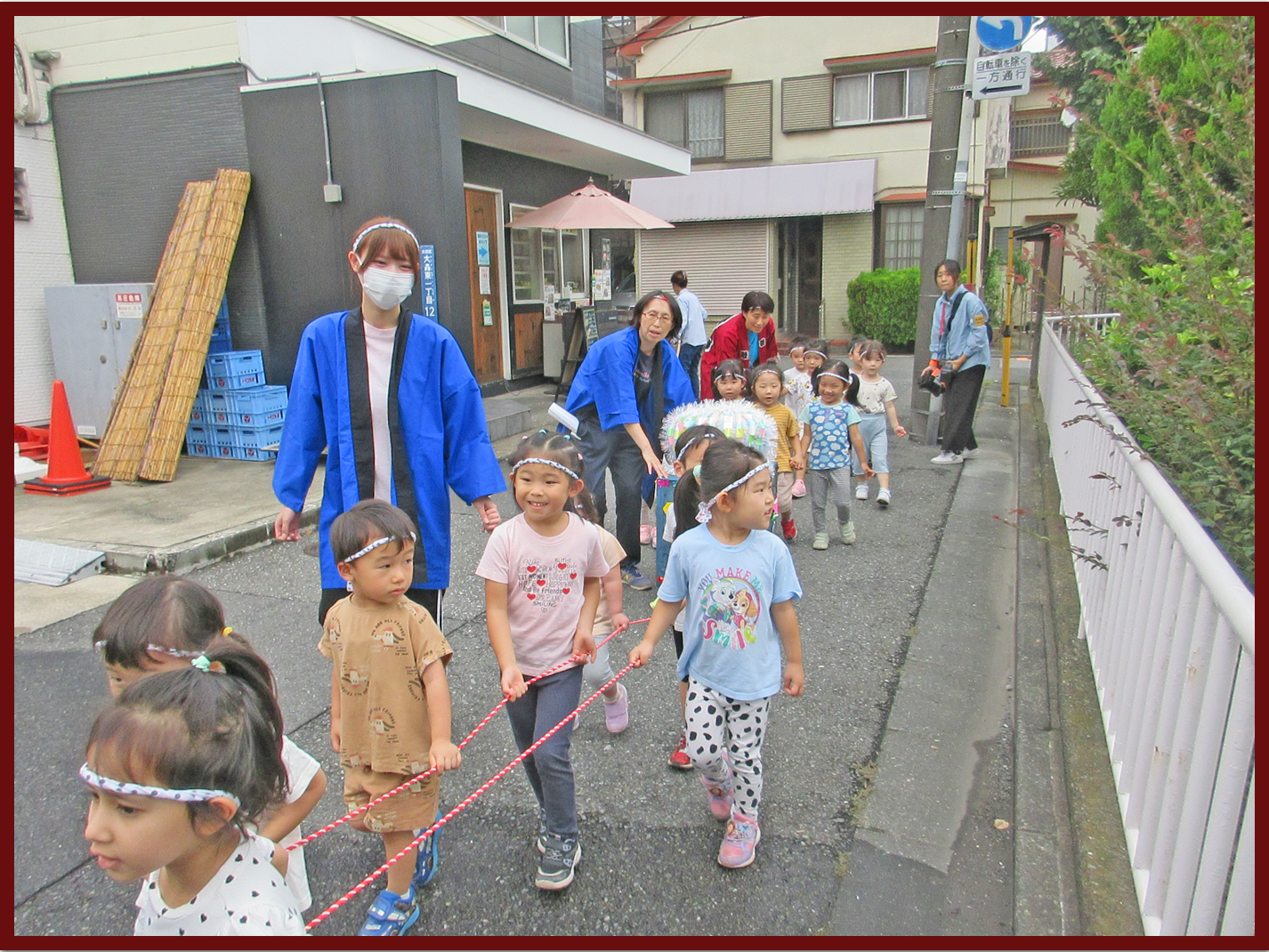 今年度は気候に恵まれ、戸外で『おまつり』を行うことが出来ました。以前から、お神輿や山車作りをしたり、神輿を担いだりして楽しみにしていました。会の前は、それぞれのクラスは支度をして元気に園庭に集まり、担当の先生の話を聞き出発しました。「わっしょい、わっしょい」と気合を入れた大きな声で掛け声をかけ園周辺を練り歩くと、小さいクラスの友だちや保護者の方々の声援も聞こえ、嬉しそうな表情や手を振って声援に返答している姿も見られました。