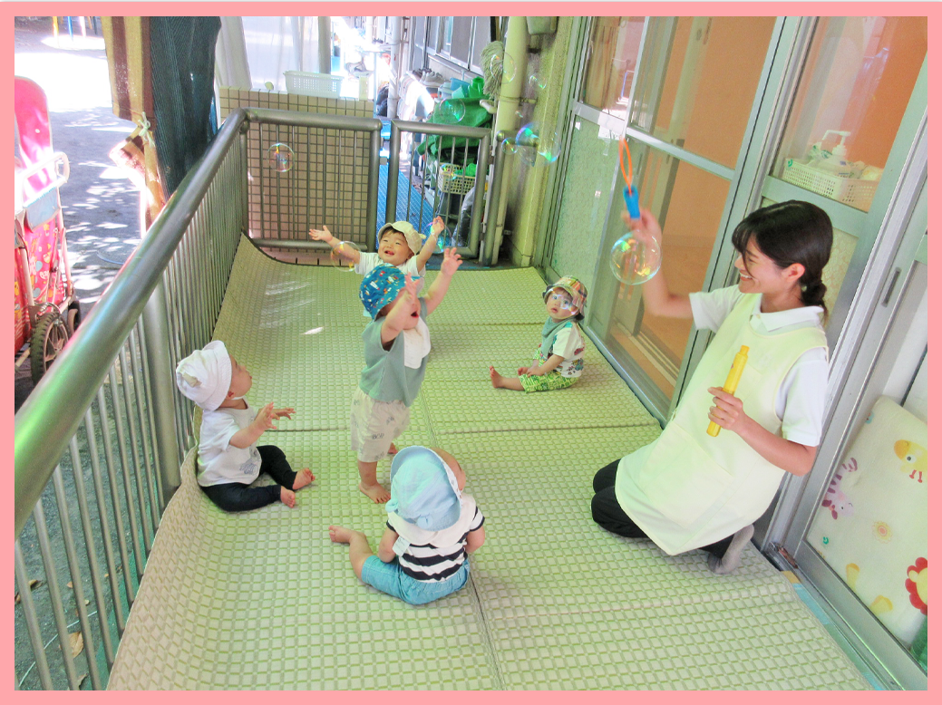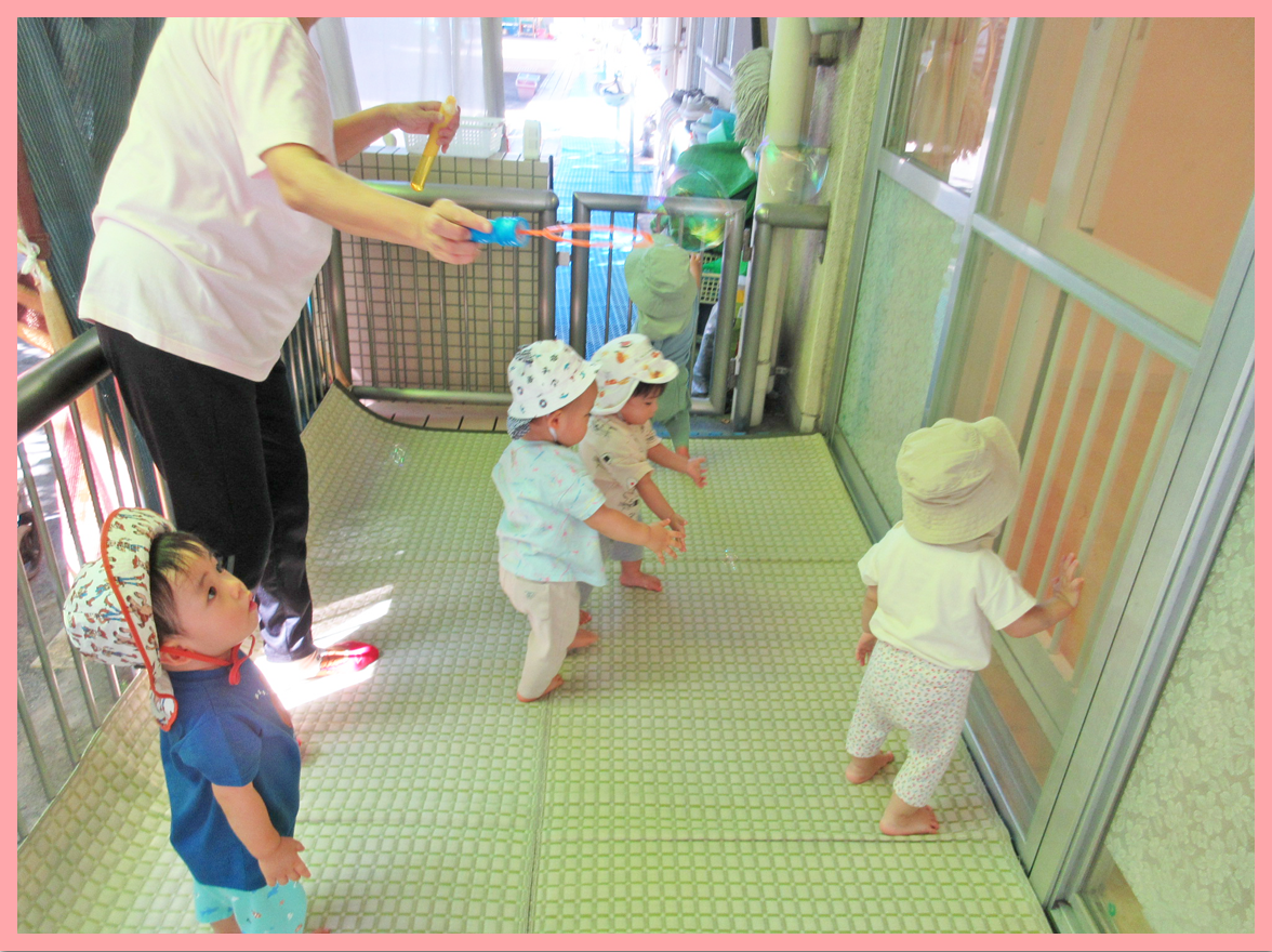 今日はテラスでシャボン玉をしました。風に吹かれて飛んでいくシャボン玉を歩いて追いかけたり、自分の方へ飛んでくるシャボン玉に手を伸ばしたりして「ぱちん」と弾ける感覚を楽しむ姿が見られました。