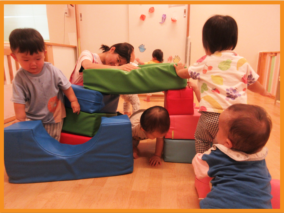 今日は、室内でソフトブロック遊びをしました。保育者が「おおきなたいこ」を歌いながら