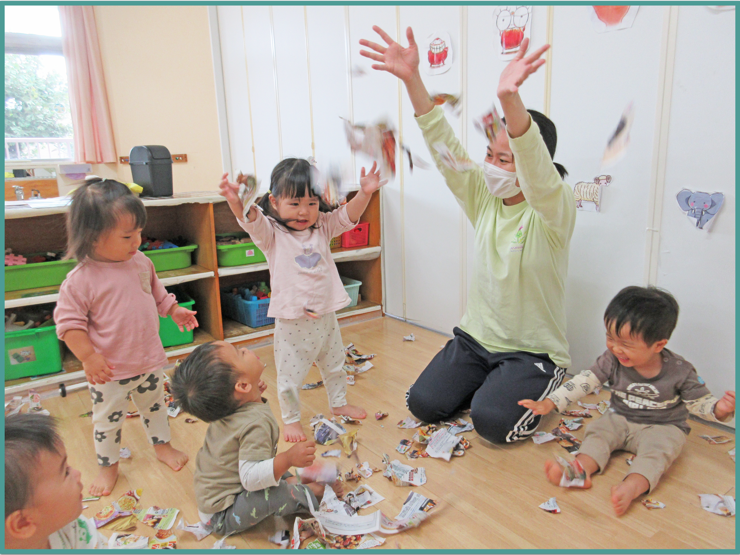今日は広告紙を使って遊びました。保育者がちぎったり、丸めたりしている姿を見て真似をしているこどもたち。広告紙シャワーが特に楽しかったようで、「さんっ、にっ、いちっ」