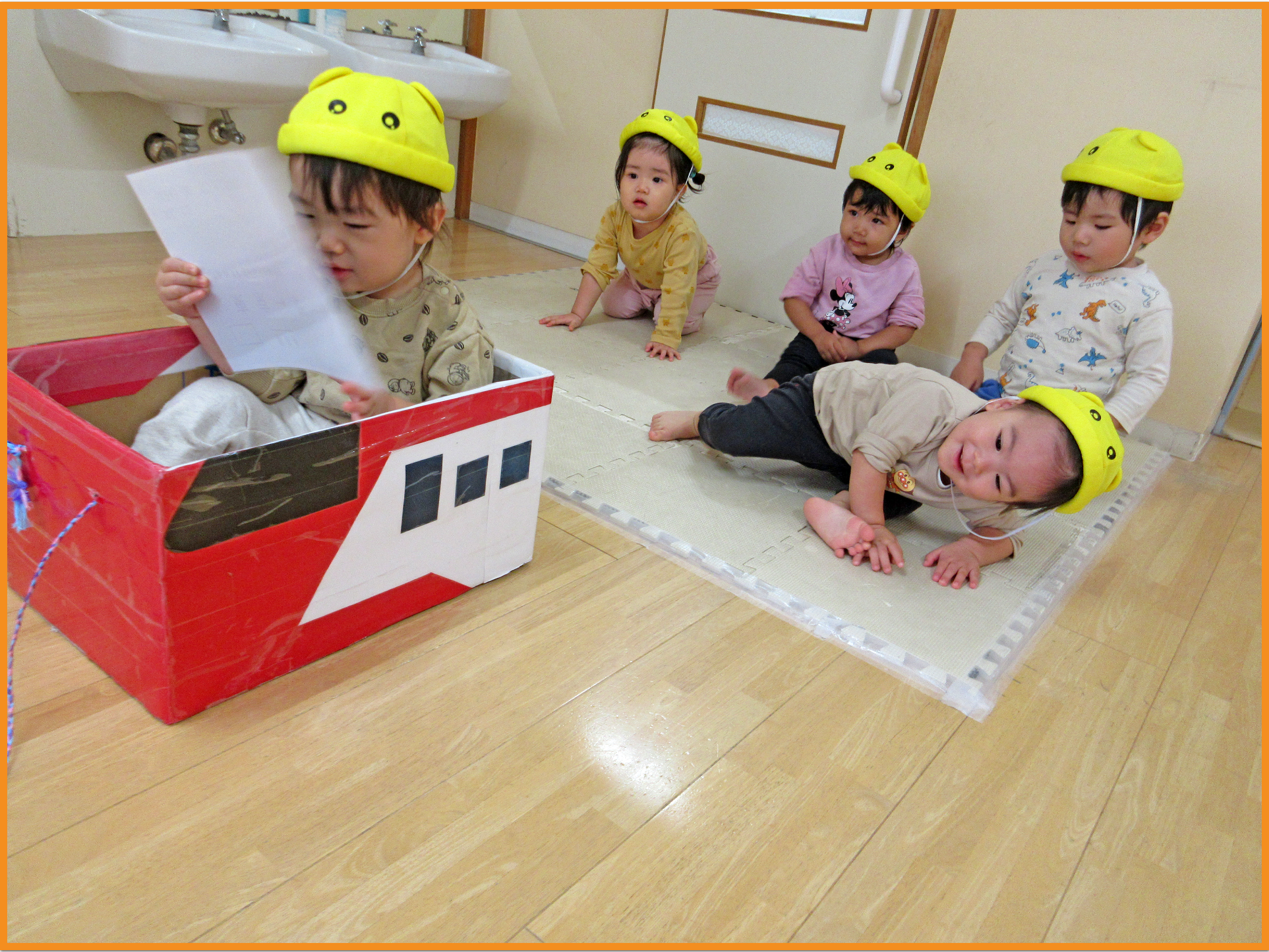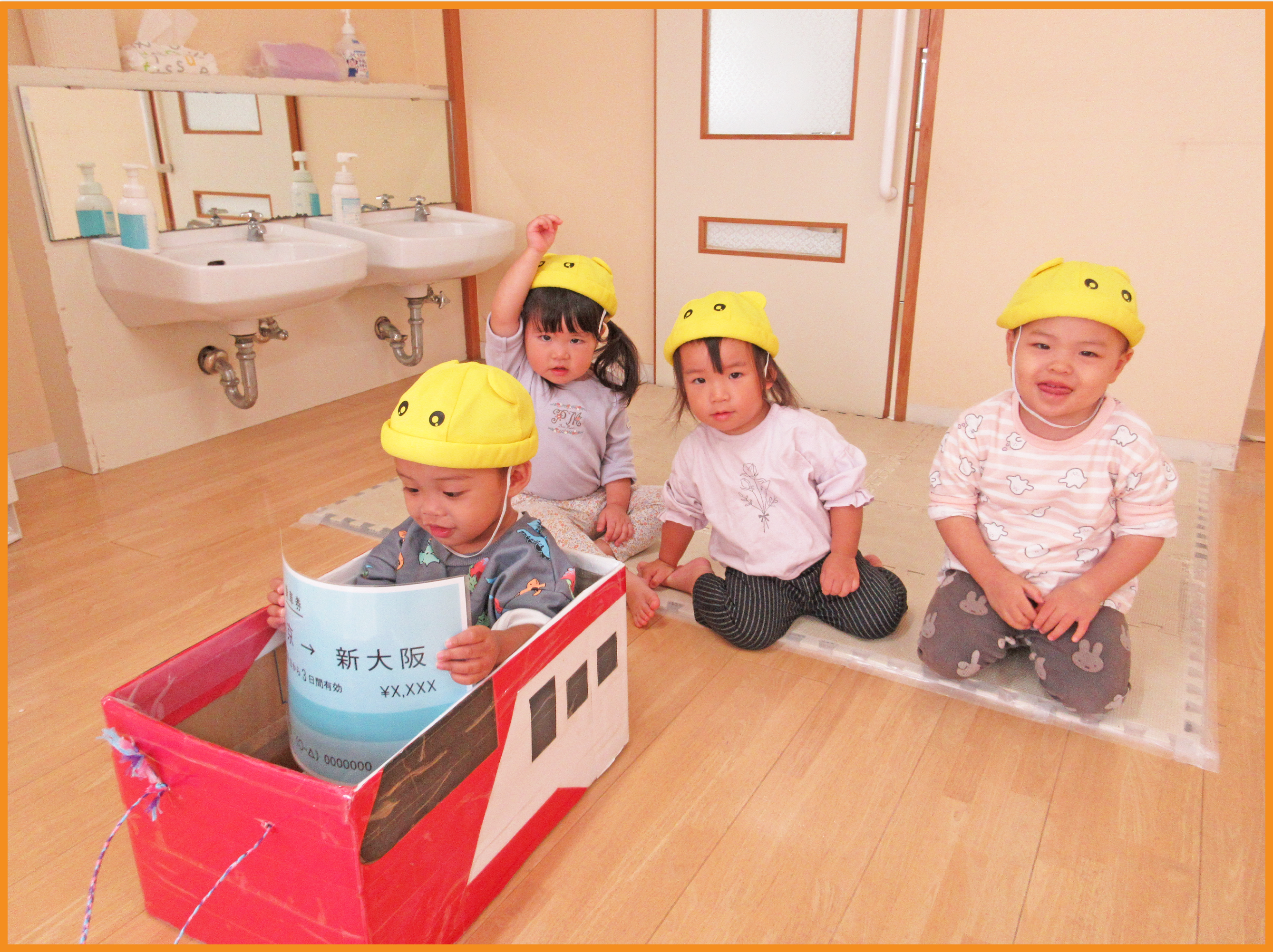 今日は、室内で運動会ごっこをしました。新幹線に見立てた箱車に乗ったり、改札に切符を通したり、トンネルを潜って遊びました。「出発進行ー」と保育者が伝えていくと、こどもたちも「しんこー」と喜んで遊んでいました。順番子に遊んでいくと「待ってるね」「いってらっしゃーい」と手を振りながら順番を待っていました。