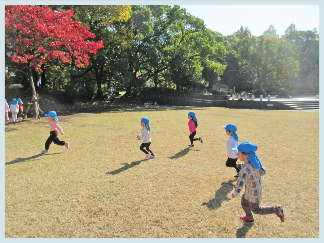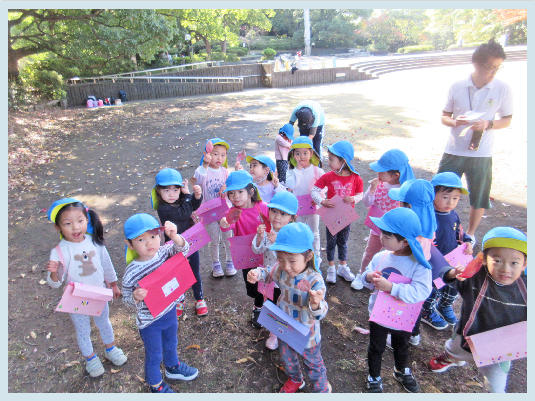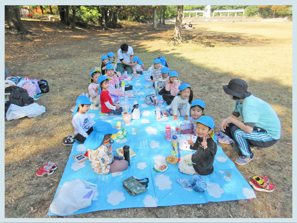 今日は待ちに待った遠足です。登園時からみんな楽しみでワクワクしていました。公園に向かっている最中も「楽しみ」「早くお弁当食べたいな」などの話をしていたこどもたち。平和の森公園では、秋探しのスタンプラリーをしました。様々な色の落ち葉、どんぐりや虫探しを行い、手作りのバッグにしまってシールを貼りました。「先生、赤色の落ち葉があったよ」「どんぐり見つけた」「虫の声が」などお話をしながら秋探しを楽しんでいました。
