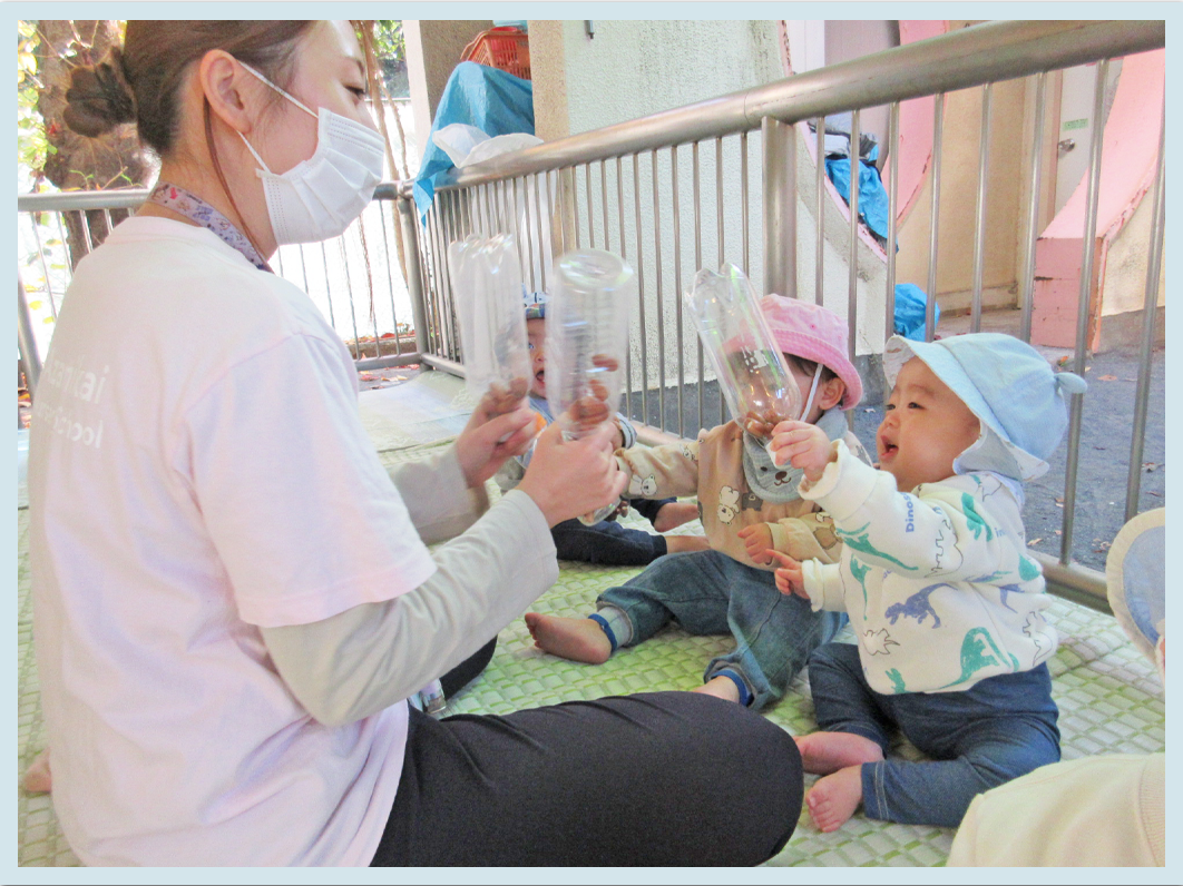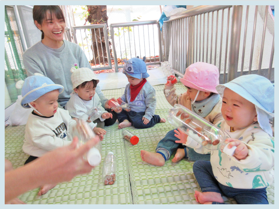 今日はテラスでどんぐりを使って遊びました。どんぐりを一粒手に取ると、口の大きな容器へポットンと落とすことに集中して遊んでいました。蓋を閉めてマラカスにすると、どんぐりが転がる感覚や重みを手で感じたり、コロコロと容器の中で動く様子を目で見たりして楽しんでいました。「どんぐりころころ」を歌いながら、一緒にマラカスを振って音を鳴らすことを楽しむ姿も見られました。