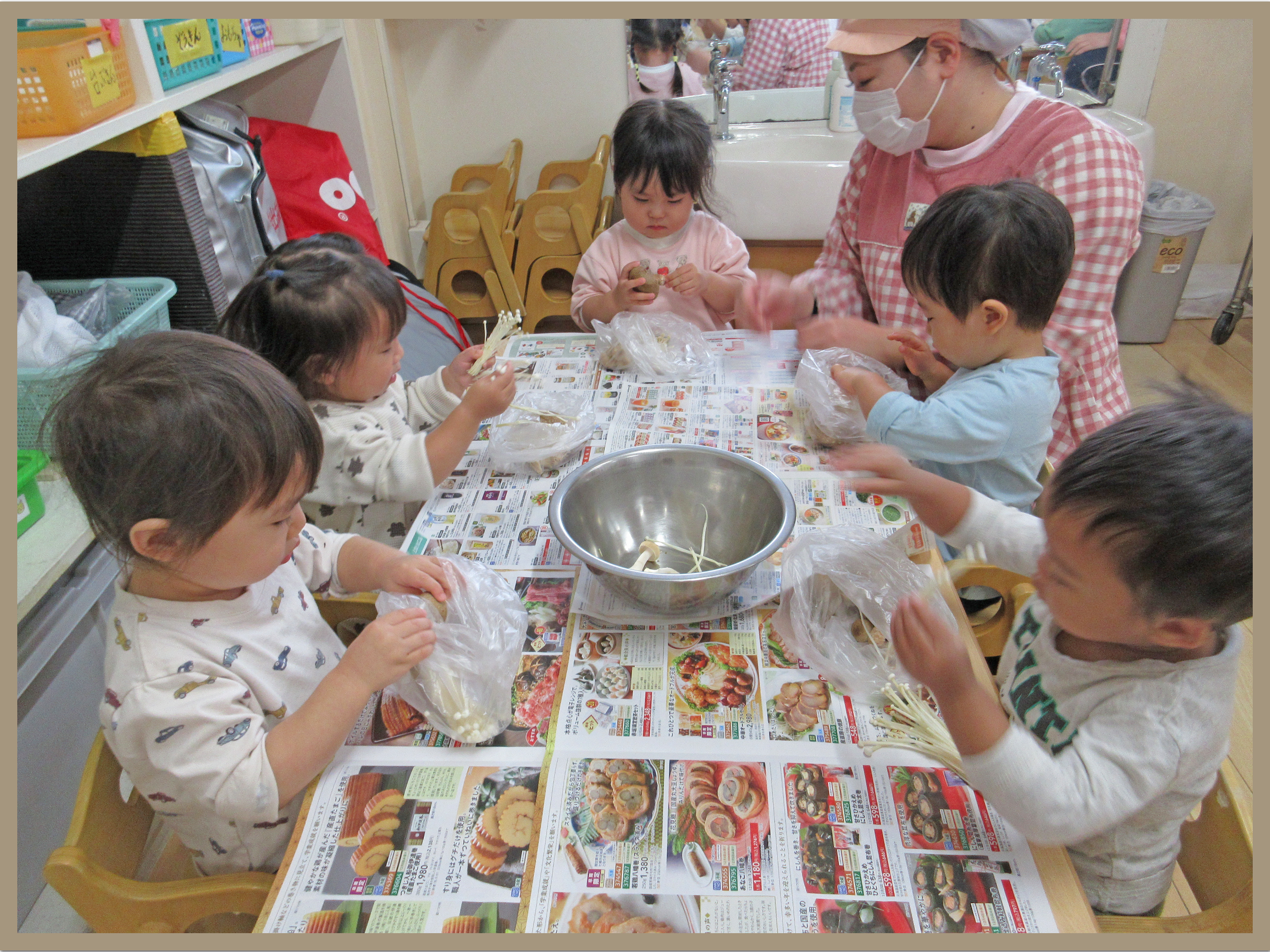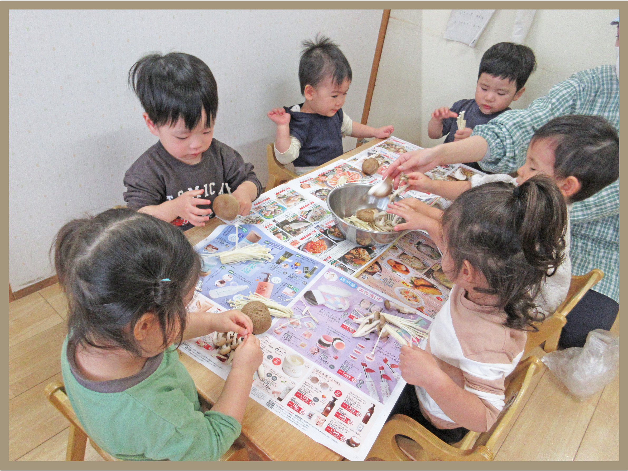 今日は、給食の先生と一緒にきのこをさく活動を行いました。前週にきのこの製作をして部屋を飾り付けしていた為、きのこを見ると「きっきっきのこ」ときのこの歌を歌って楽しそうに参加することが出来ました。えのき・しめじ・しいたけのきのこの違いを感じながら細かくさいていきました。ひとつずつ細かくさく子もおり、集中して行っていました。明日のおやつに食べるのを楽しみにしているこどもたちでした。