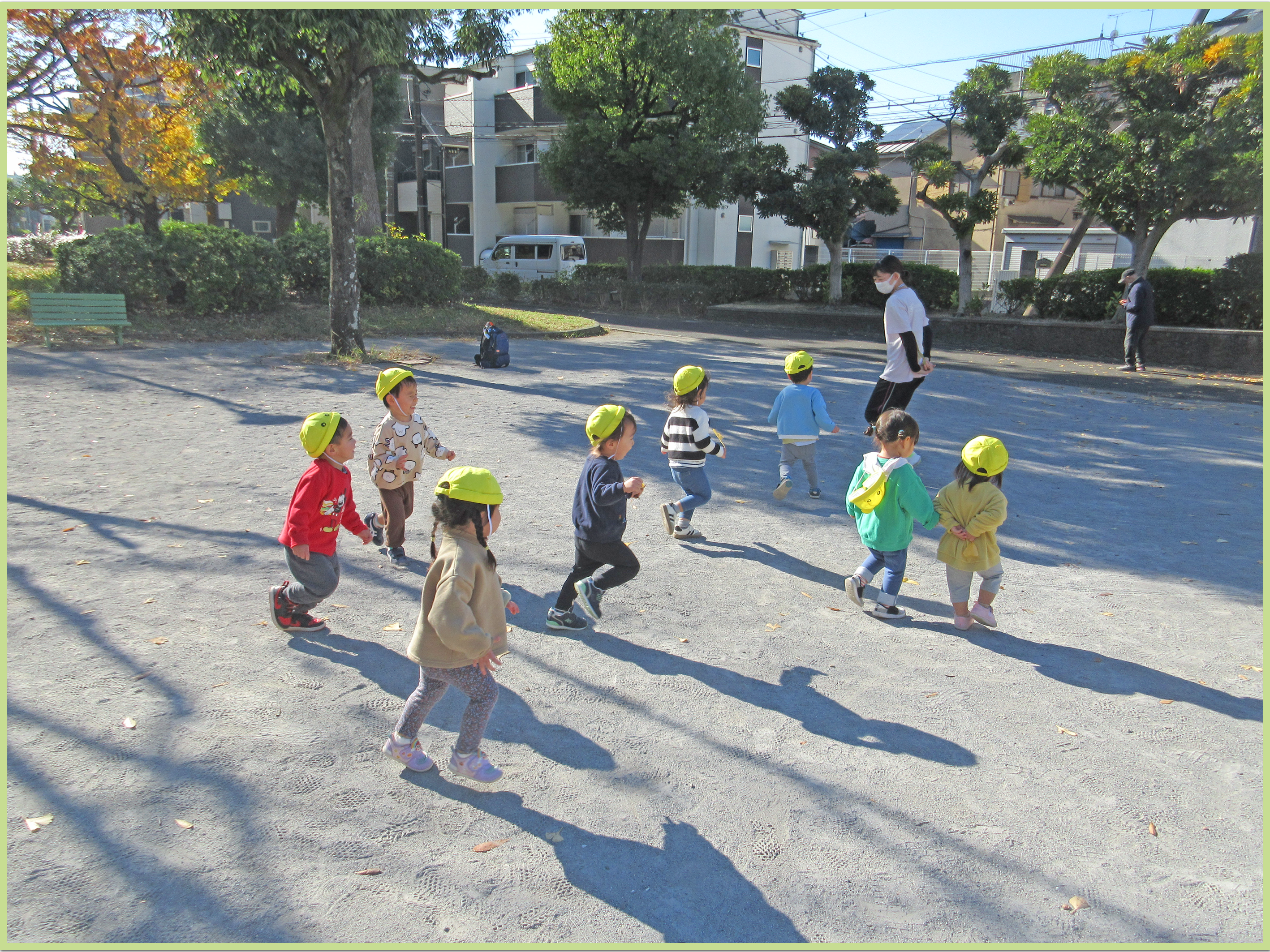 公園では、木の周りのレンガを線路に見立てると1列になって「しゅっしゅっぽっぽー」と電車ごっこをしてみたり、どんぐりの帽子を保育者の手のひらに集めてみたり、言葉のやり取りを楽しみながら元気いっぱいに遊ぶ姿が見られました。
