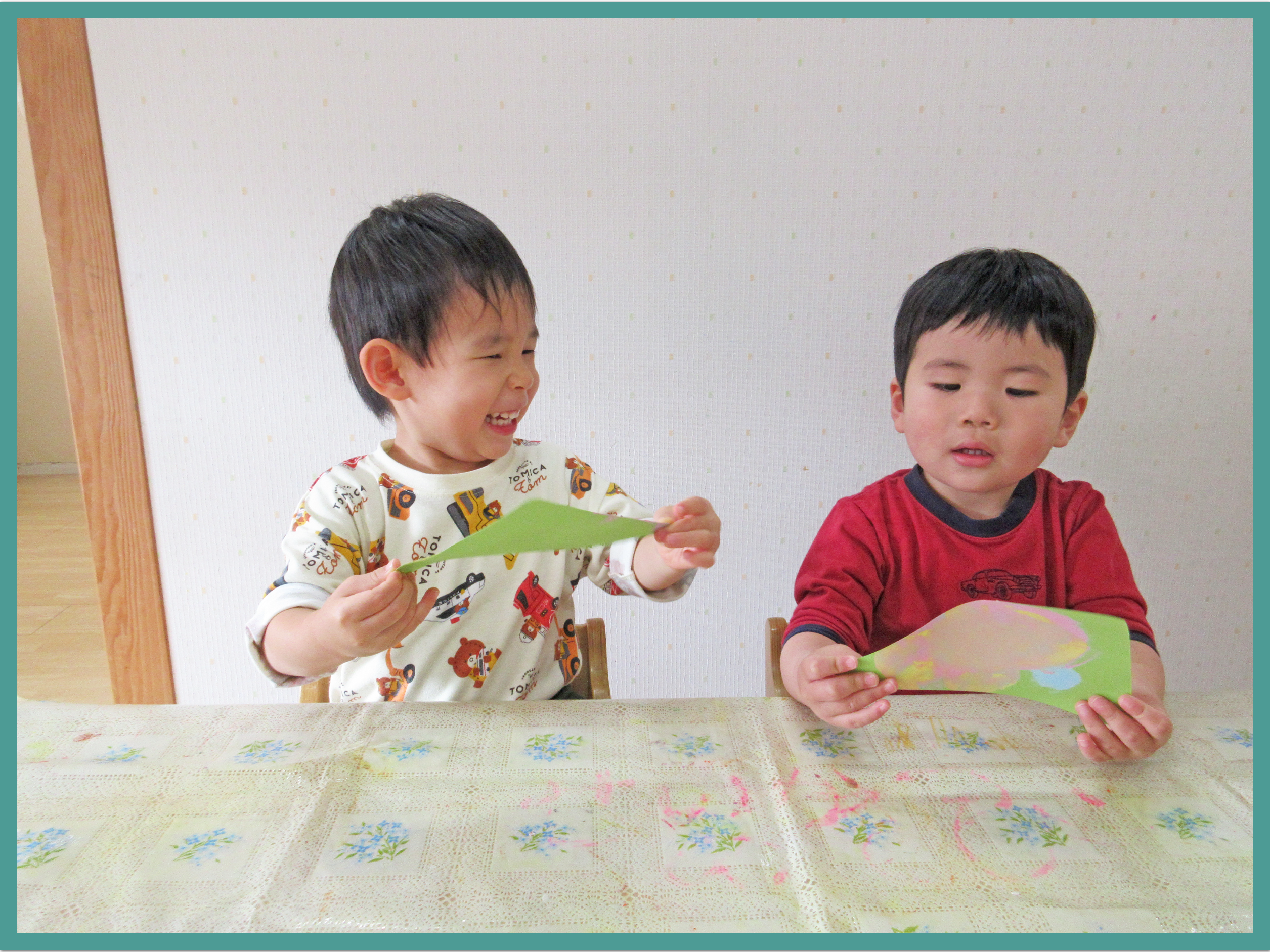 今日は、室内でクリスマスの製作をしました。始めに雪だるまのマフラーの色を選び、顔やボタンをシールで貼っていきます。「可愛いね」「おめめできた」と嬉しそうにお話ししながら貼るこどもたち。小さな風船を使ってツリーに色付けをする際には、保育者の言葉を真似して「ぽよん、ぽよん」と言いながら風船の跳ね返りを楽しんでいました。完成した作品をお友だち同士で見せ合いながら、「じゃじゃーん、見て、じゃじゃーん」と繰り返し話す姿が微笑ましかったです。
