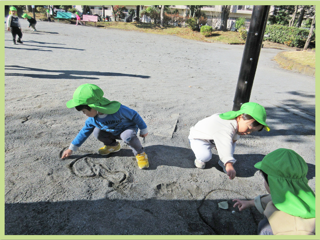 公園では、友だちを誘って追いかけっこをしたり、地面に絵を描いたりして遊びました。