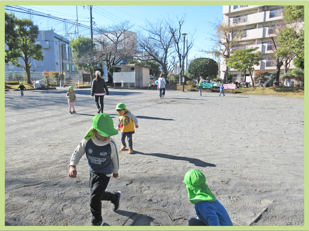 お散歩のお約束を守って、少し距離のある公園まで歩くことが出来るようになってきたちょうちょ組のこどもたち。