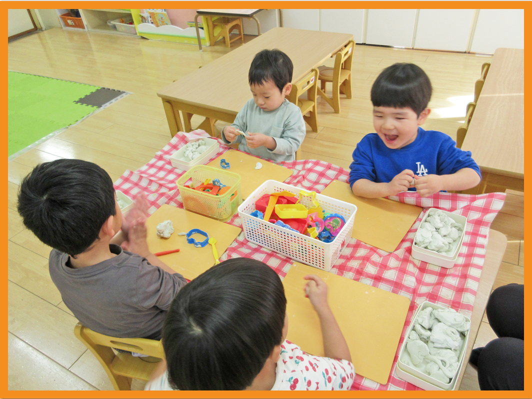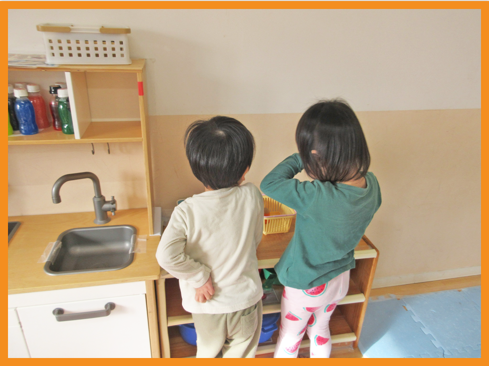 今日は、長期休みの後だったので室内でゆったりと過ごしました。朝の会でこどもたちに何をして遊びたいか聞いてみると「電車」「おままごと」「サンタさんにもらったブロック(フラワーブロック)」とたくさんのリクエストが出たので、遊ぶ場所を分けて好きな遊びを楽しみました。「プップー先生見て」「入れて」「一緒にやろう」「こっちで遊ぼう」などおともだちや保育者を誘い合いながら一緒に遊ぶ姿が増え、遊びの幅も広がってきました。