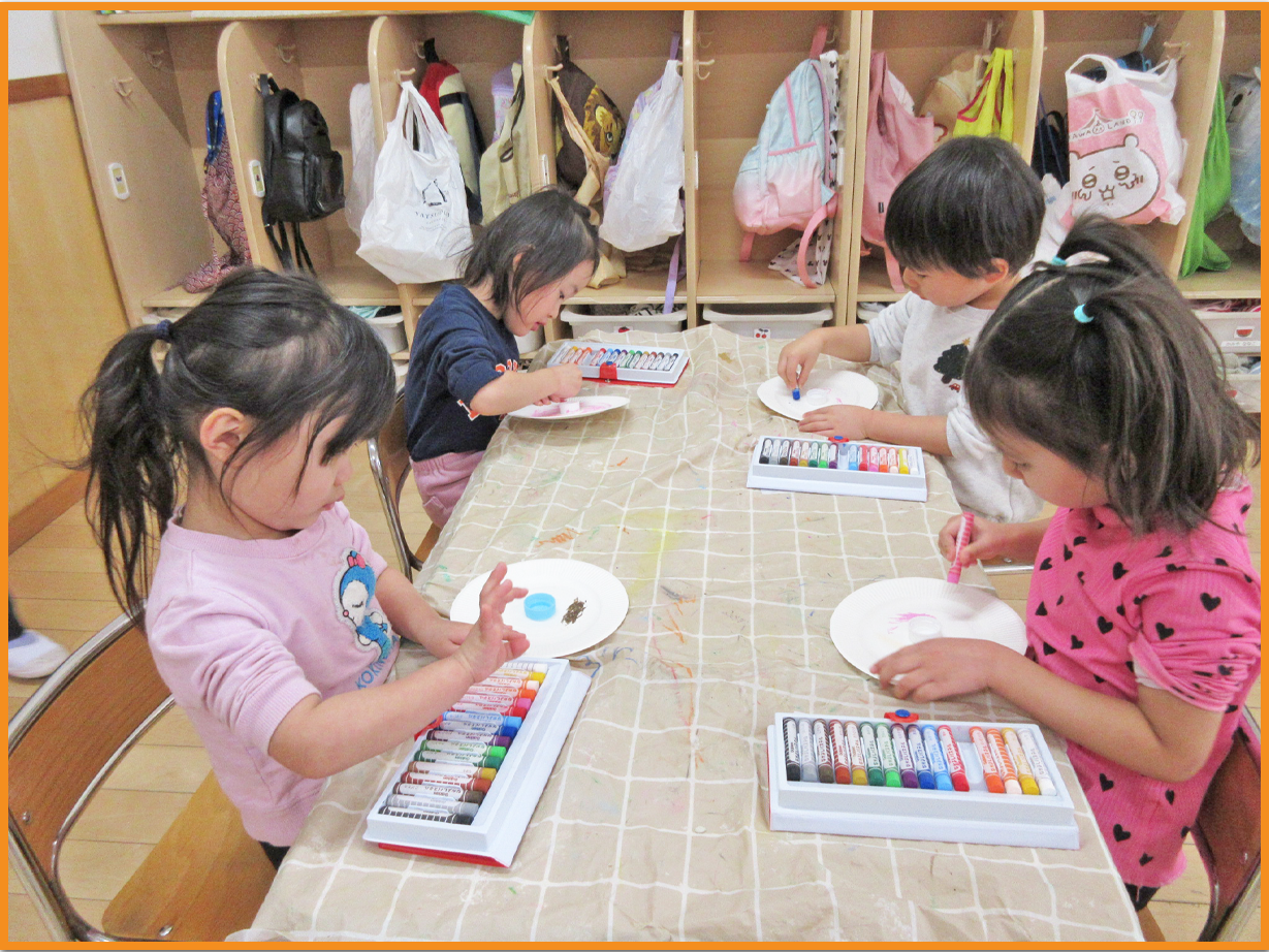 また、幼児クラスでは、室内でこま製作をしてコマをくれよんで色付けしてオリジナルのコマづくりをしました。実際にコマを回し、友だちとコマを一緒に回して楽しみました。
